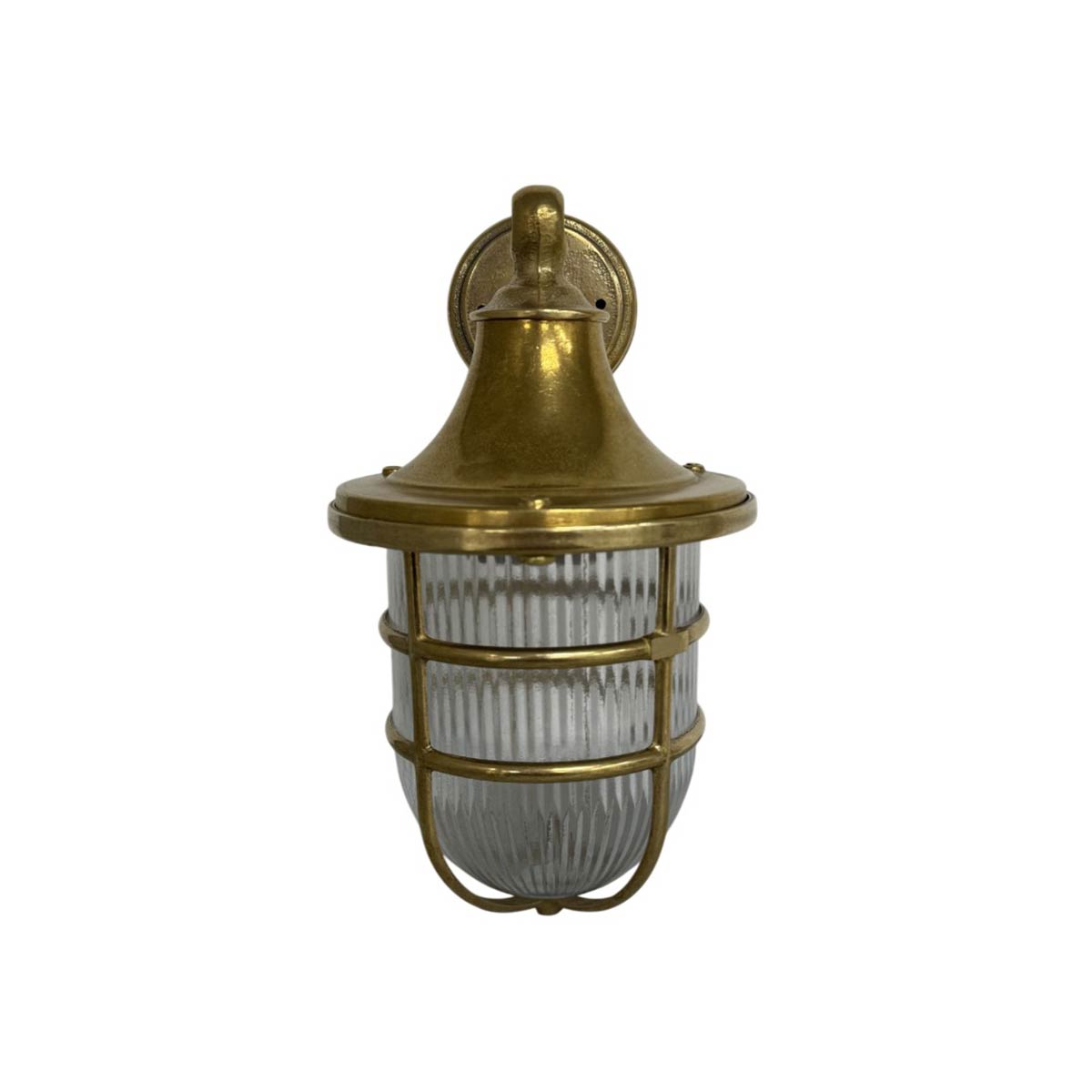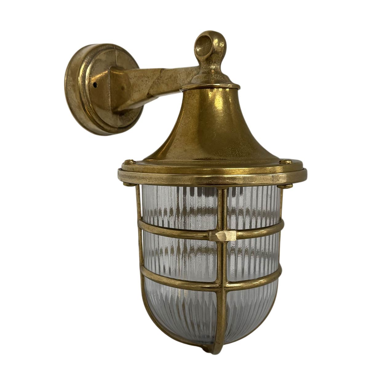 This large Tiller solid natural brass outdoor wall lantern is rated IP64 and features nautical style. Safe to use outdoors in all weathers, it is made from solid brass left in its raw natural state and ideal for use in severe weather coastal locations. Featuring a circular wall mount, slender arm and downward facing ribbed pill glass shade with an outer protective cage.