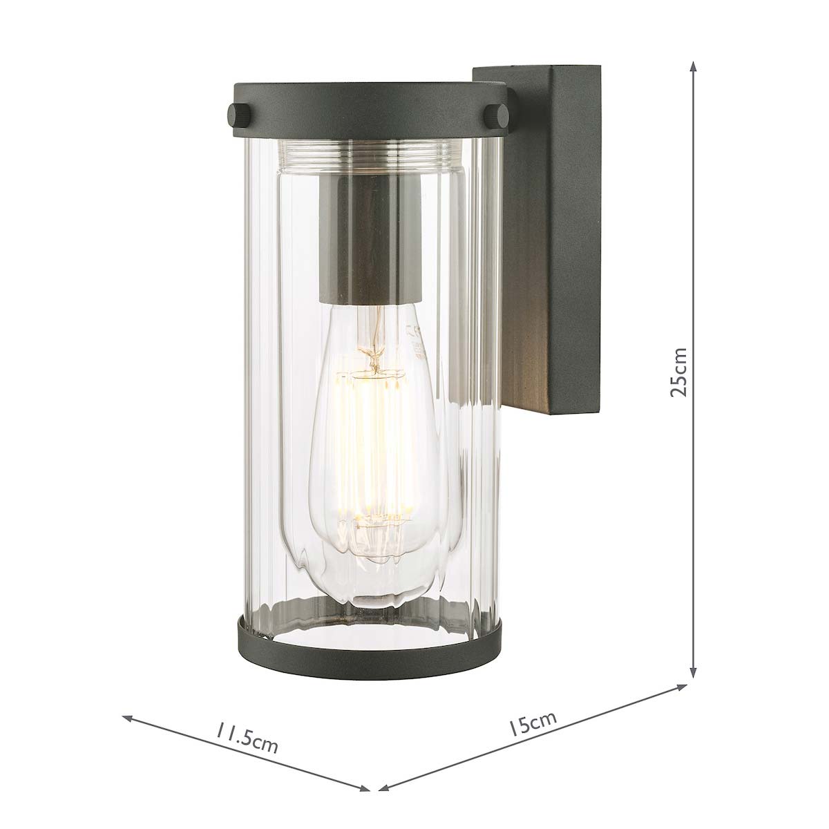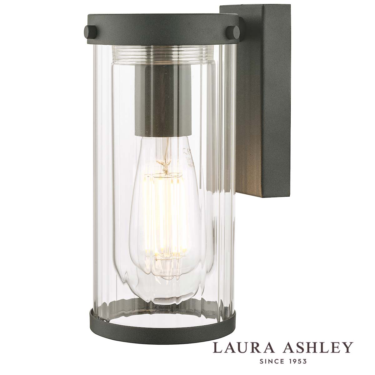 The Arthur outdoor wall light in matt black finish with clear ribbed glass shade and rated IP44 by Laura Ashley is elegantly proportioned and contemporary. Featuring a rectangular wall mount, top support ring and downward facing clear ribbed glass cylinder shade. This exterior wall light is finished in a matt black powder coating and is ideal for a front porch or alongside a doorway.
