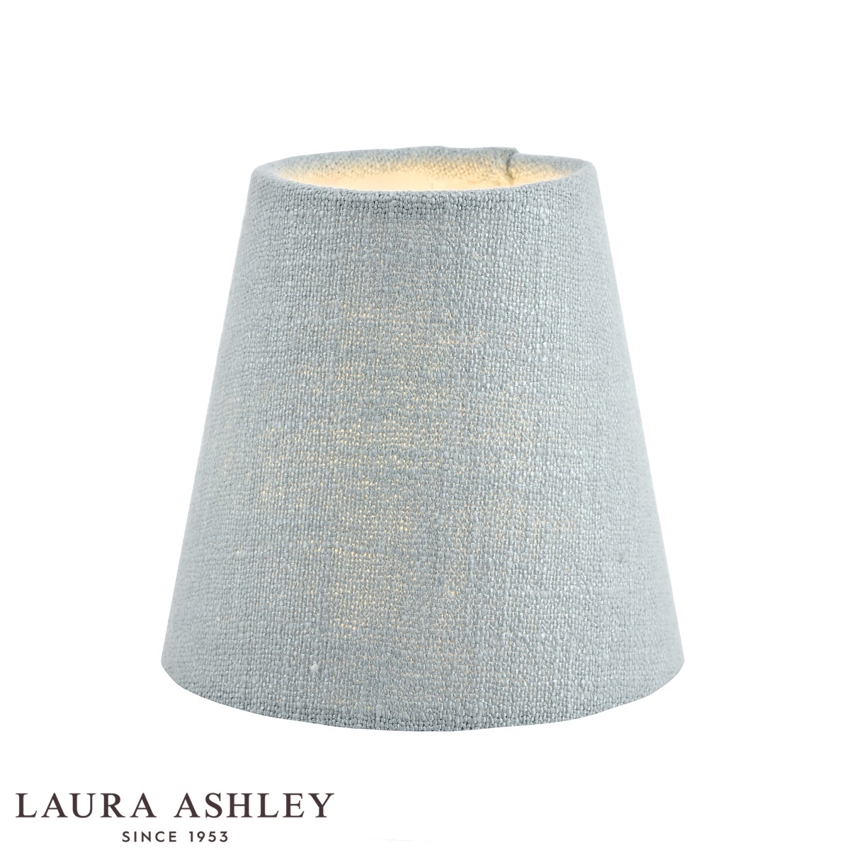 The Laura Ashley Bacall 40cm duck egg blue linen shade in the classic empire style. A 16-inch diameter tapered drum shaped shade in white lined slubbed duck egg blue linen fabric.