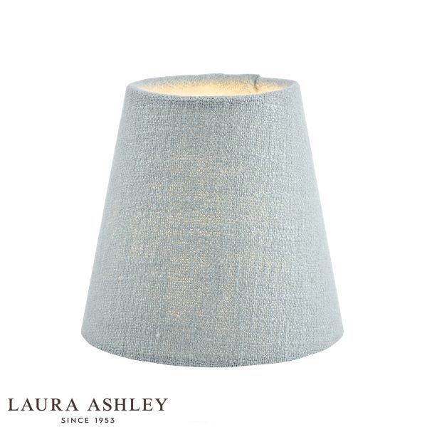 The Laura Ashley Bacall 5 inch duck egg blue linen clip on shade in the classic empire style. A 12.5cm diameter tapered shade in white lined slubbed duck egg blue linen fabric.