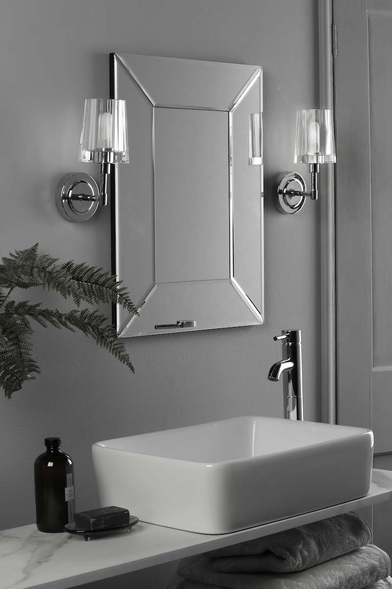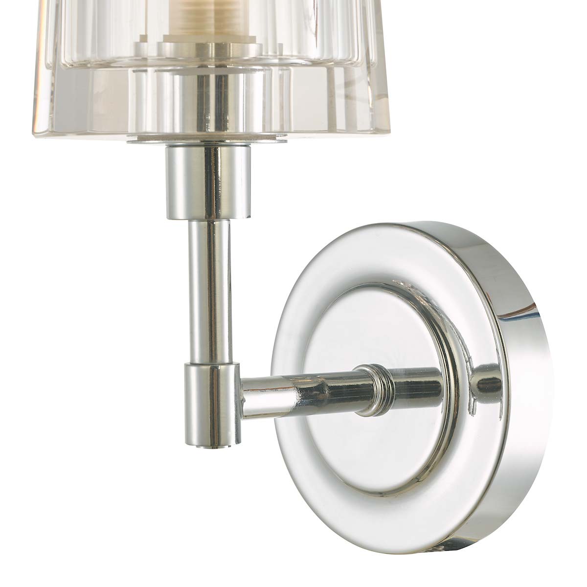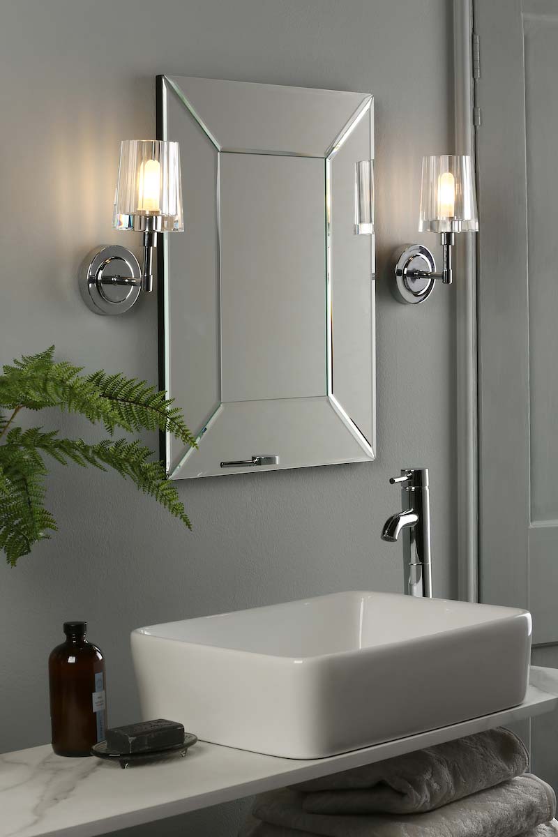 The beautifully crafted clear cut crystal shade stands out on the Blake bathroom wall light from Laura Ashley. Featuring a circular wall mount, short arm and upright stem, with tapered ribbed clear crystal cylinder shade housing the bulb. With polished chrome plated metalwork, this wall light complements any bathroom and are ideal for either side of a mirror.