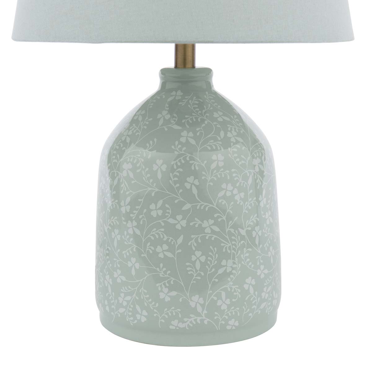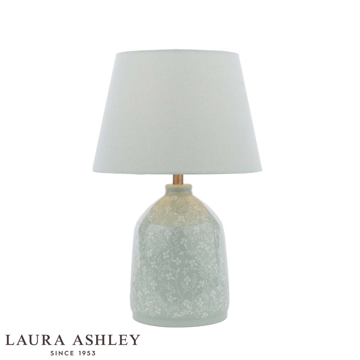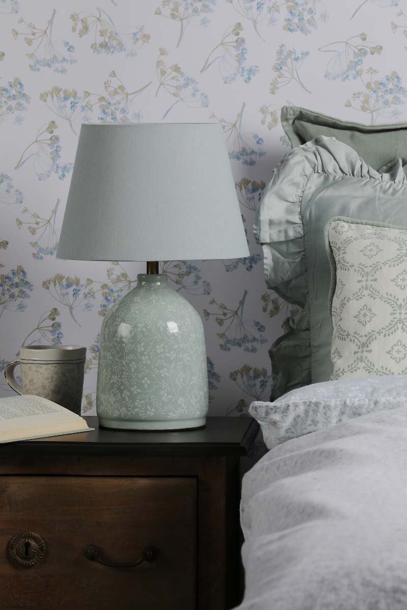 The Laura Ashley Campion blue ceramic table lamp with pale blue linen shade brings a touch of signature style into your living room or bedroom. Featuring a country style vase base, with a stylised floral print with petalled flowers alongside trailing and curving leafy stems. Supplied with a 25cm diameter soft blue linen shade, this petite lamp ideal for a bedroom or living room.