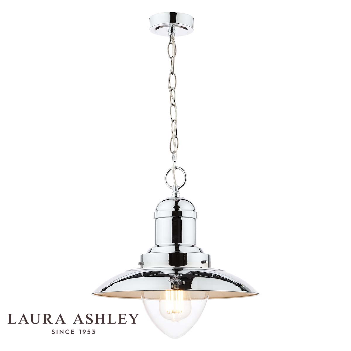 The Laura Ashley Corbridge pendant lantern in polished chrome with clear glass shade. Recreating the traditional fisherman style, it’s ideal for placing over a dining table, breakfast bar or kitchen island. Featuring circular ceiling mount, chain suspension and 33cm diameter wide brimmed lantern, with a clear glass shade for bright all round light.