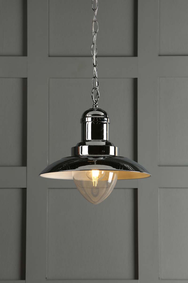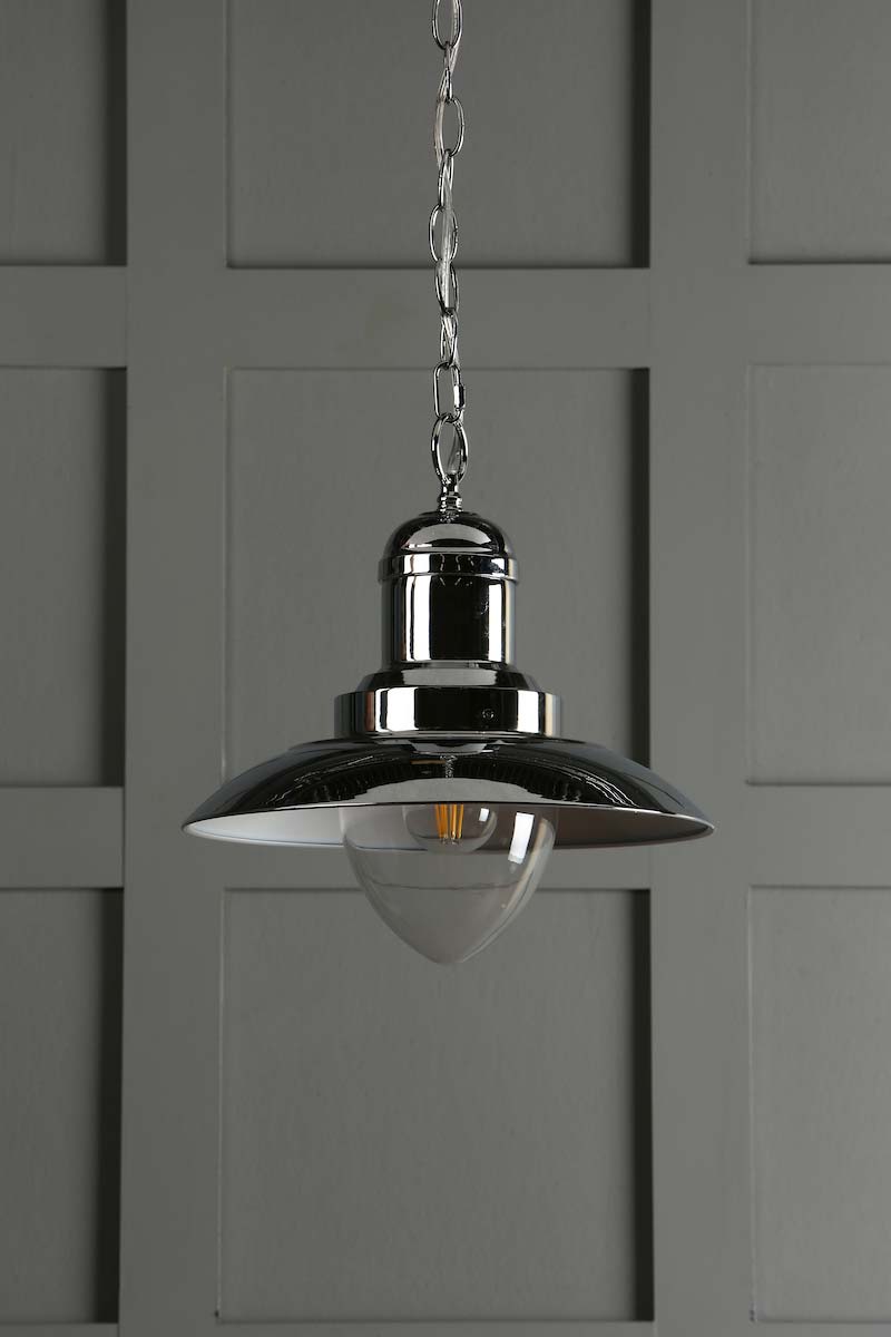 A classic fisherman style polished chrome plated metal lantern that directs all the light downwards and looks fantastic in traditional and contemporary settings alike. Height adjustable when fitting and dimmable when used with dimming bulbs.