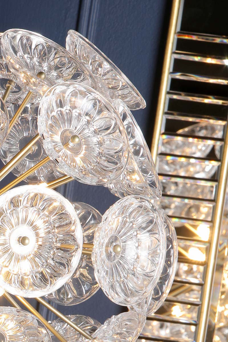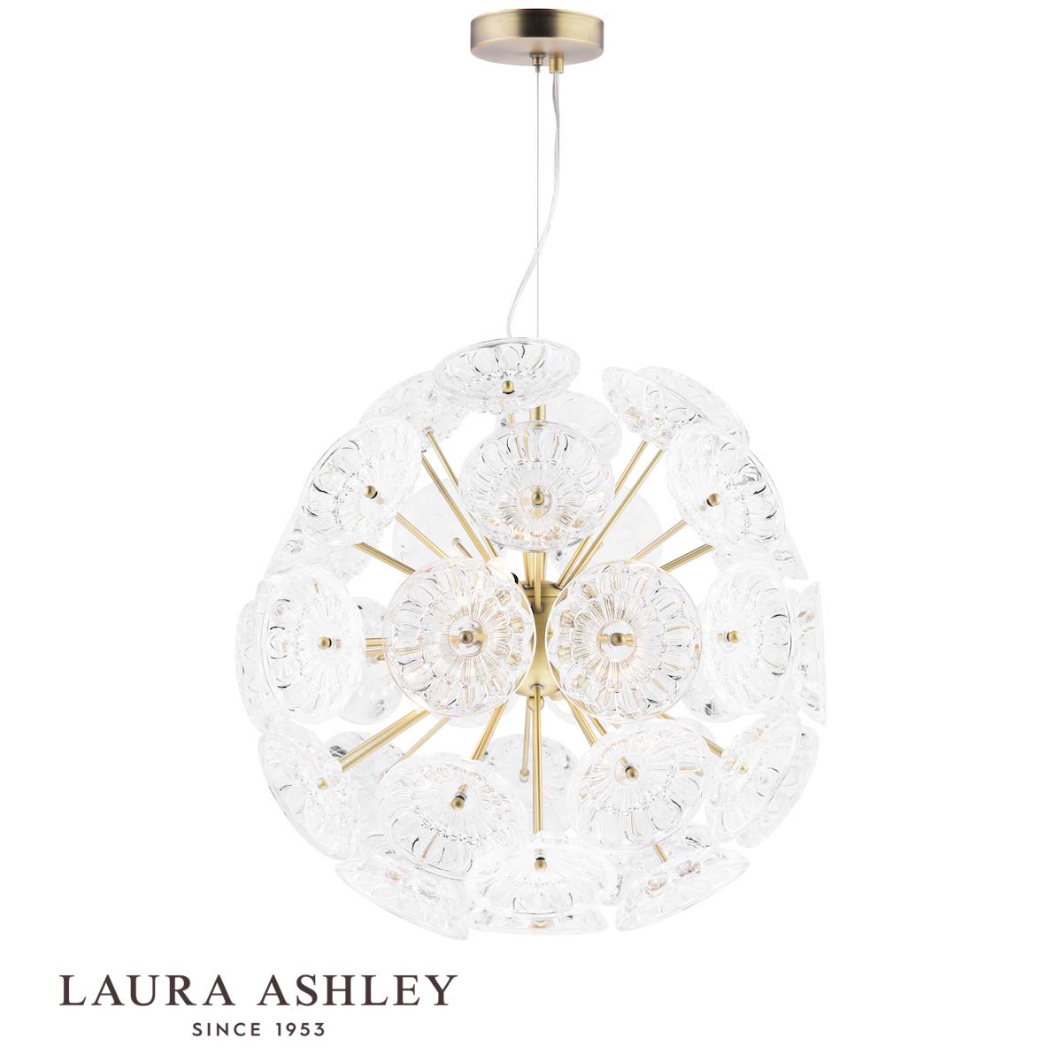 The Laura Ashley Elwick 6 light pendant with textured glass in matt antique brass finish creates a sense of drama. Featuring a circular ceiling mount, fine wire and clear cable suspension, with pressed clear glass dishes supported on rods creating a beautiful sphere. The glass dishes beautifully refract the light when lit, and the matt antique brass finish is timeless.