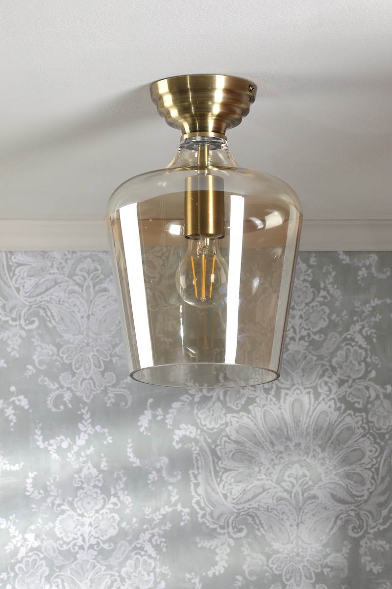 Featuring an 11.5 cm diameter ceiling plate, bulb holder and shade mount finished in antique brass, and the 21 cm diameter champagne glass goblet shade creates a warm light. Specifically designed for rooms with a low ceiling and suitable for other rooms, this light makes a sophisticated statement.