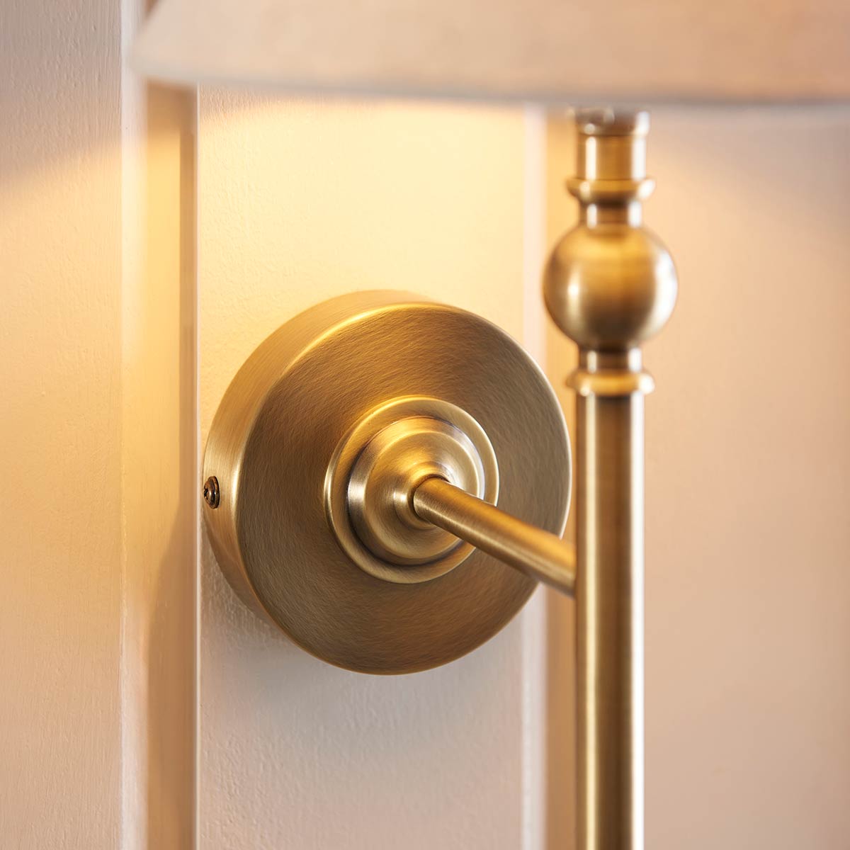 The Lille antique brass single wall light with natural faux linen shade features traditional 20th century style. An elegant wall lamp, featuring a circular wall mount, straight arm and tall upright spindle, topped with a natural faux linen tapered shade for an authentic look. Supplied unswitched and dimmable when paired with suitable bulbs and wall switch.