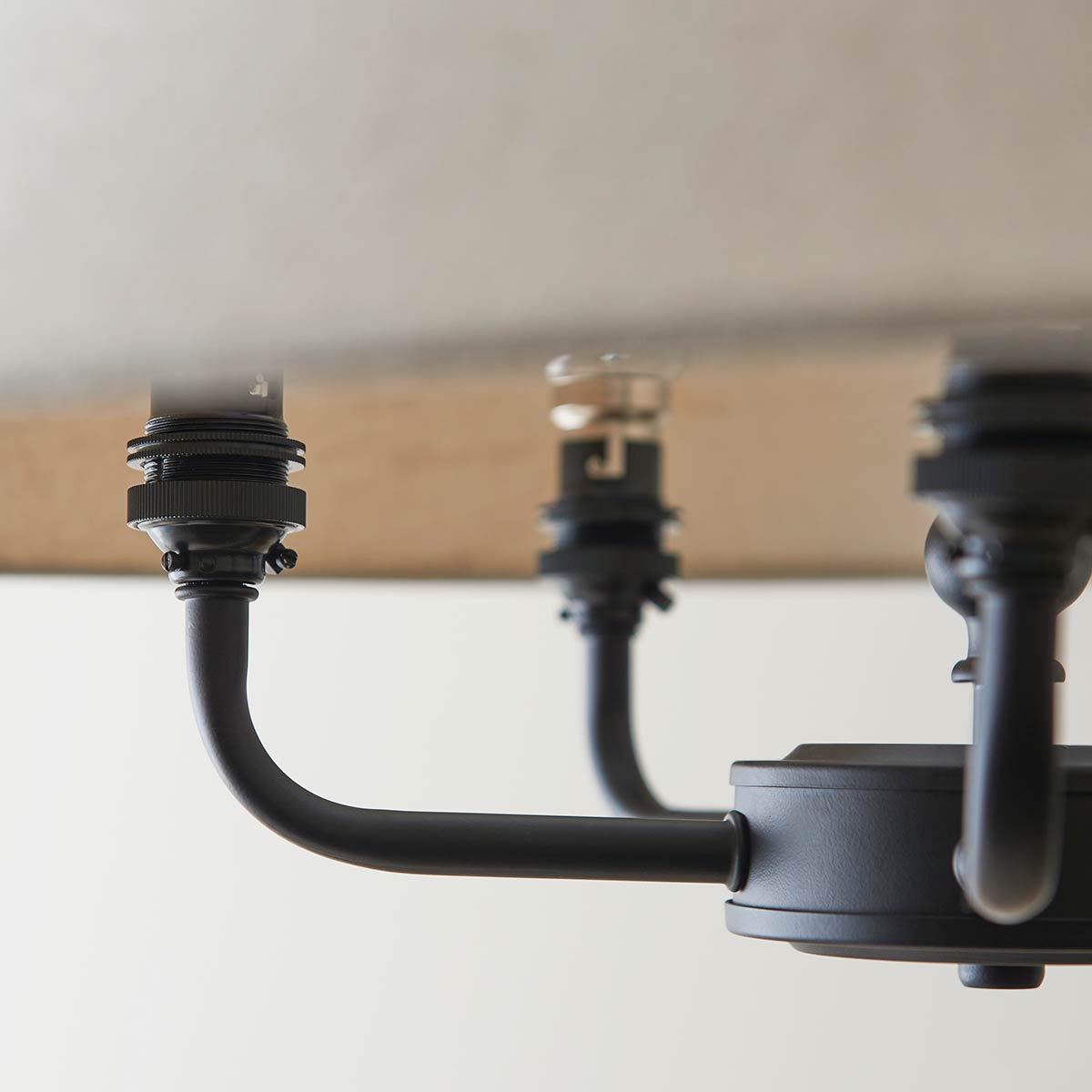 The Lille classic 5 light pendant in matt black with natural faux linen shade features traditional 20th century style. An elegant ceiling light, featuring a circular ceiling mount, chain suspension and compact 5 arm candelabra covered by a 60cm diameter natural faux linen tapered shade for an authentic look.