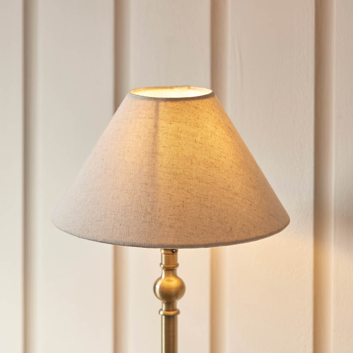 The Lille small antique brass candlestick table lamp with natural faux linen shade features traditional 20th century style. An elegant table light, featuring a stepped square base and candlestick baluster stem, with a 22cm diameter natural faux linen tapered shade for an authentic look. Supplied with 1.5m of black fabric cable, UK plug and switched lamp holder.