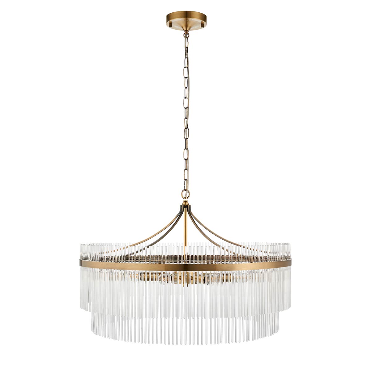 Stunning luxury that’s ideal for lighting a hallway, living room or over a dining room table, the Marietta Grand 7 light pendant chandelier in antique brass with clear glass rods by Endon Lighting.