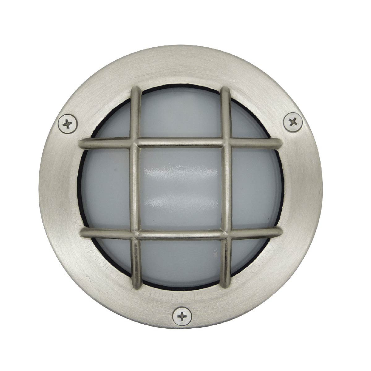 This Marina small solid brass bulkhead path light in satin nickel finish is rated IP64 and features classic nautical style. Safe to use outdoors in all weathers, it is made from nickel plated solid cast brass and ideal for use in severe weather coastal locations. Featuring a circular 14cm diameter body, with domed frosted glass shade and protective outer guard.