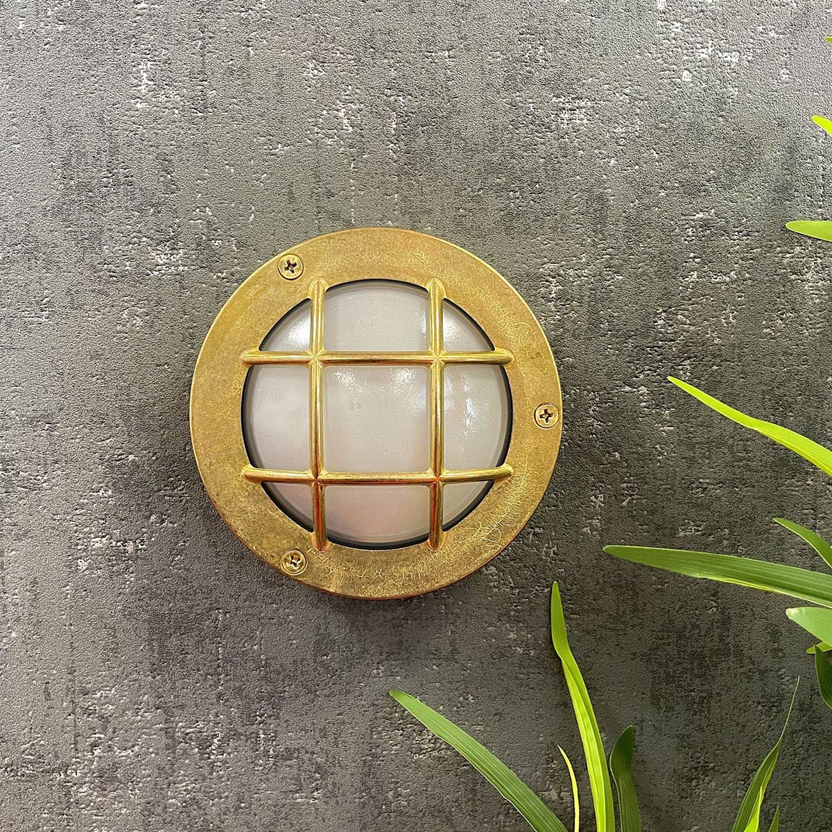 This Marina small solid raw brass bulkhead path light is rated IP64 and features classic nautical style. Safe to use outdoors in all weathers, it is made from solid cast brass left in its natural raw state and ideal for use in severe weather coastal locations. Featuring a circular 14cm diameter body, with domed frosted glass shade and protective outer guard.