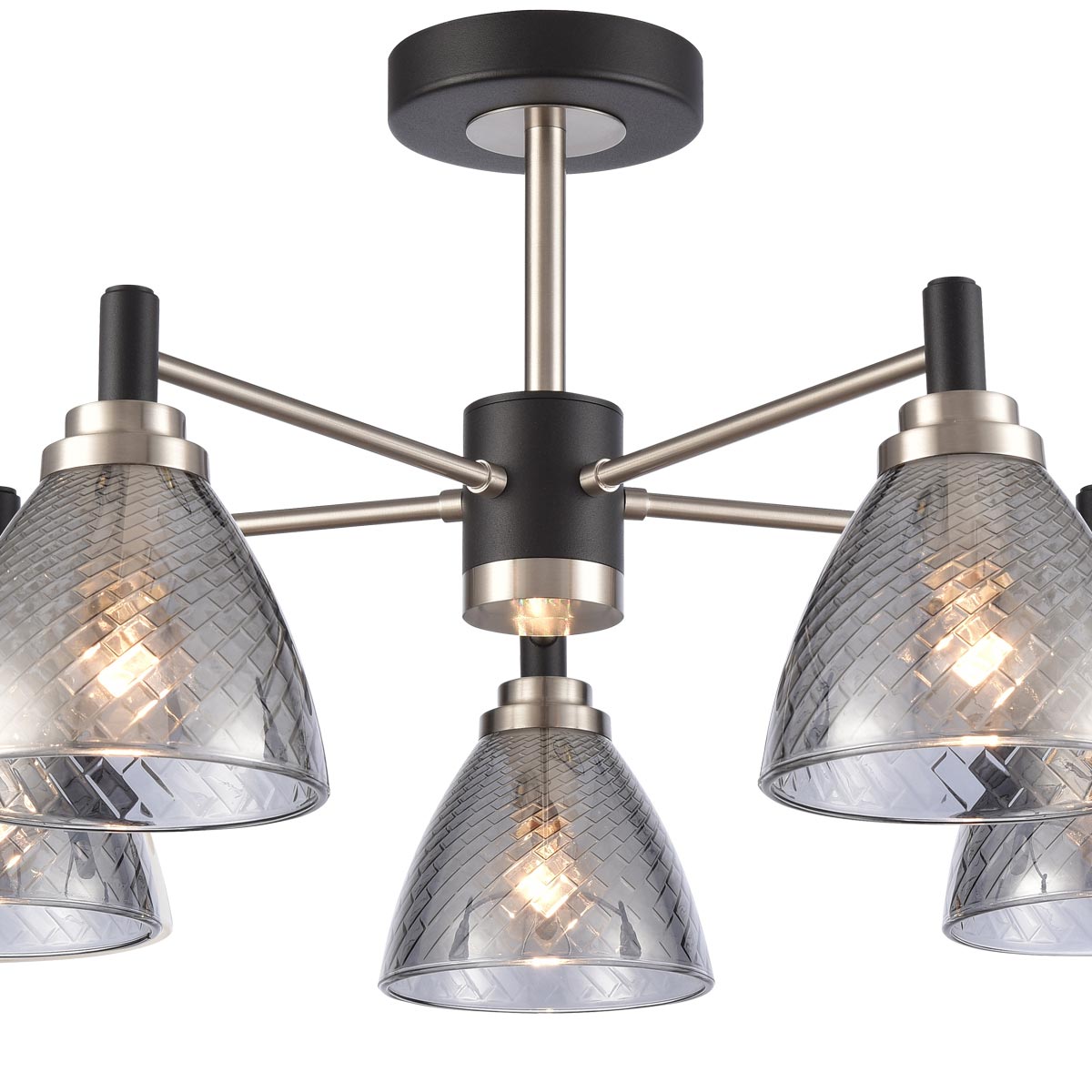 The Metro 5 light semi flush ceiling light in matt black and satin nickel with smoked glass shades from Franklite. Designed for rooms with a low ceiling, the Metro features a circular matt black ceiling mount, short drop rod and five straight arms in satin nickel. Each arm features a downward facing smoked glass shade with a modern subway tile design.