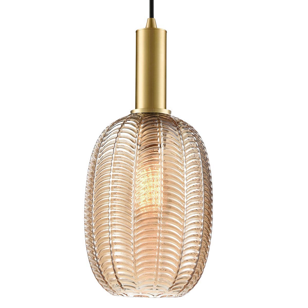The Mezcla aged brass ceiling pendant with amber chevron glass shade by Franklite is traditional and stylish. Designed to enhance your bedroom, kitchen, living or dining room, this pendant features a tall 18cm diameter amber chevron glass shade. Hanging from an aged brass finish mount and height adjustable braided black suspension cable.
