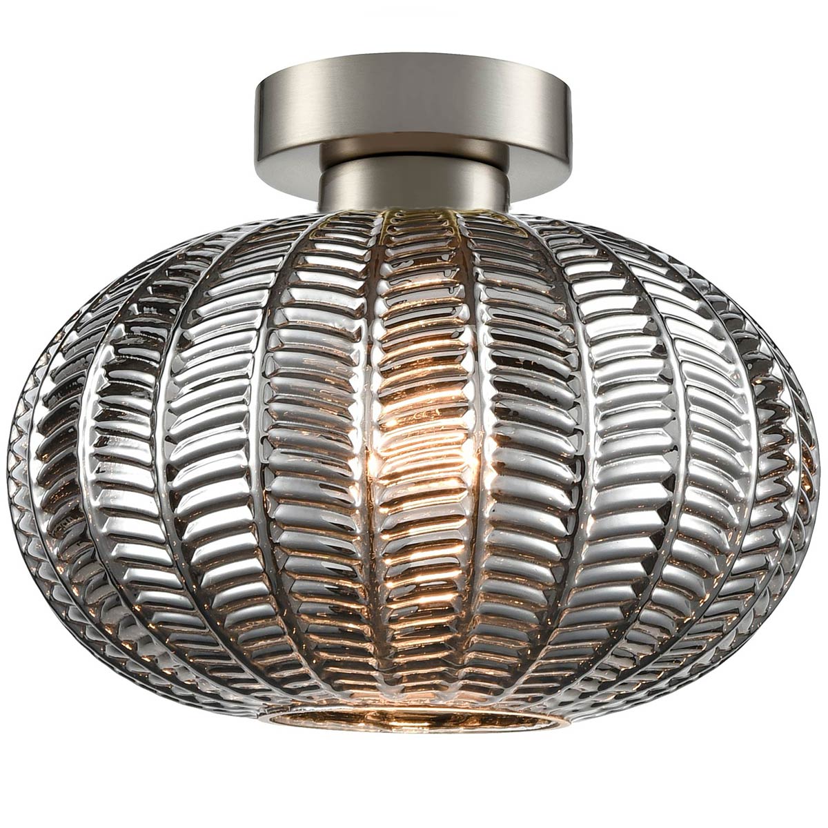 At home in both traditional and modern homes, the classic looks and flawless finish make this ceiling light the ideal choice in any room with a low ceiling. The satin nickel finish is timeless, and the smoked chevron glass creates texture. Ideal for a bedroom, breakfast, living or dining room.