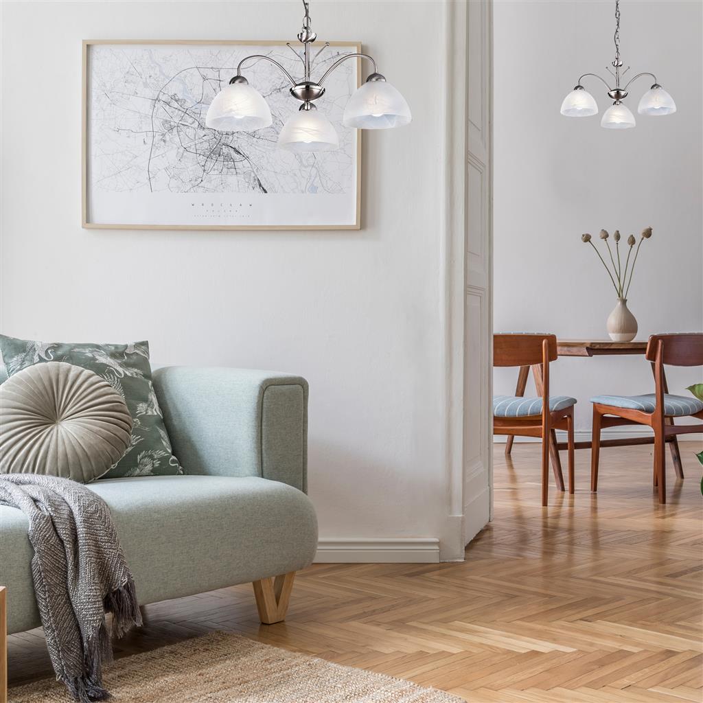 The sleek fitting has a decorative metal centrepiece, with classy satin silver finish curved arms leading on to three downward facing alabaster glass shades. This fitting can be suspended from a chain or fitted flush to the ceiling to create the desired effect, making it suitable for rooms with a low ceiling.