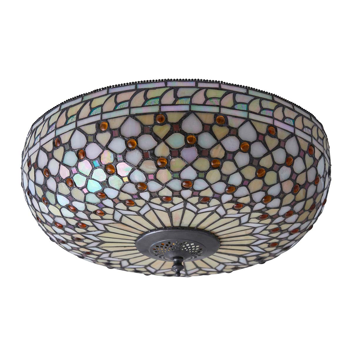 The Mille Feux large flush fitting 2 lamp Tiffany ceiling light uses many pieces of cream Tiffany art glass in a geometric pattern, and is inlaid with glass bead work. With a wonderful smooth bowl shaped dome, this flush Tiffany ceiling light fits closely to the ceiling making it ideal for low ceilings.