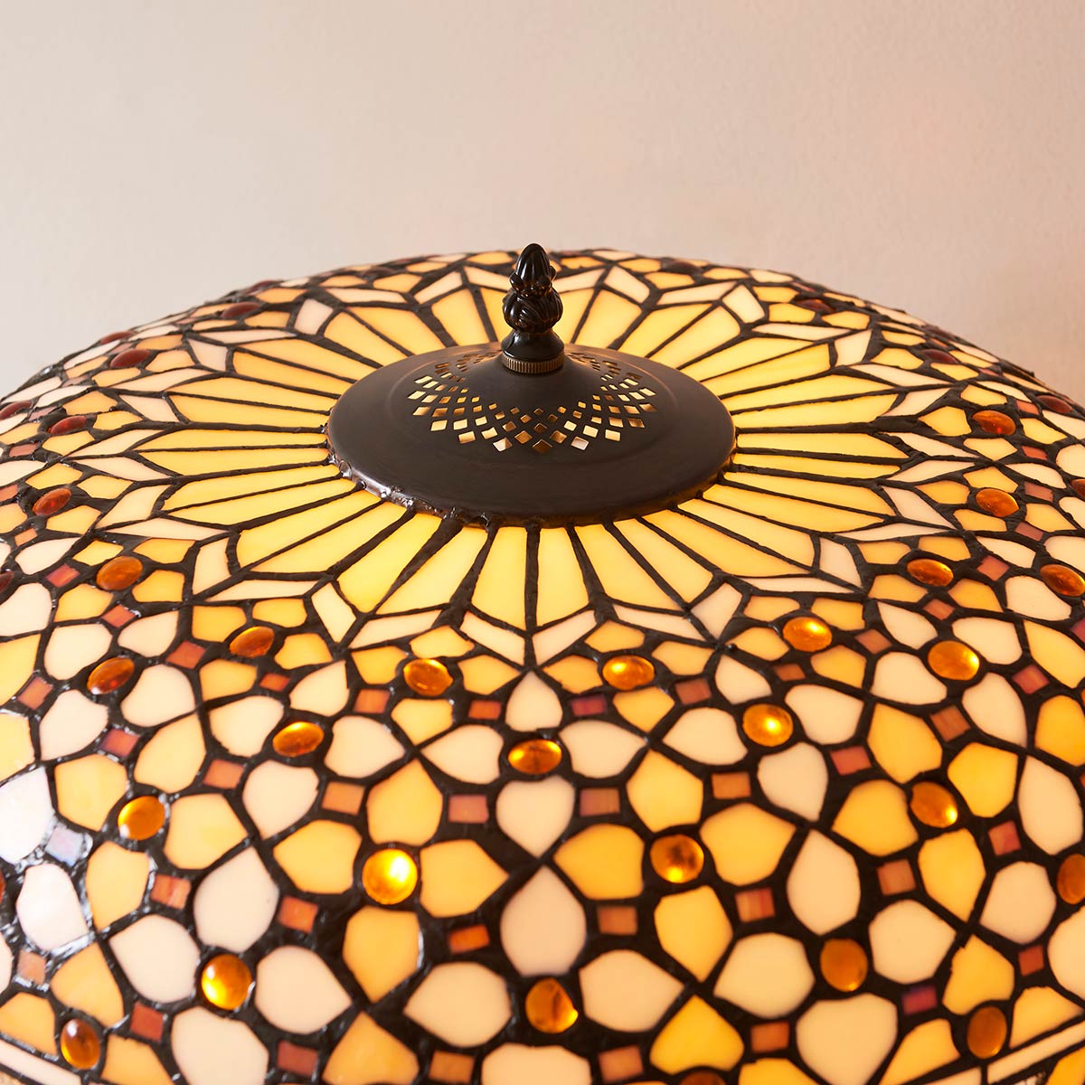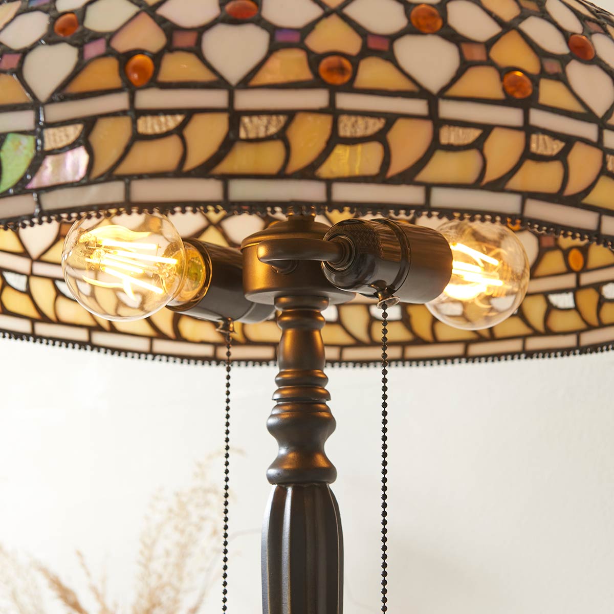 The Mille Feux large Tiffany table lamp 2 light uses many pieces of cream Tiffany art glass in a geometric pattern, and is inlaid with glass bead work. With a wonderful 45cm diameter bowl shaped dome shade, this Tiffany table lamp sits on a detailed die-cast metal base and is fitted with two independent pull chain switches.