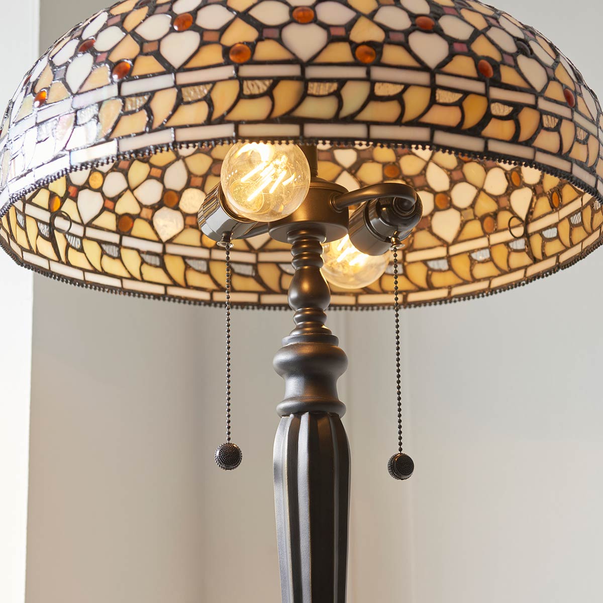 The Mille Feux Tiffany floor standard lamp 2 light uses many pieces of cream Tiffany art glass in a geometric pattern, and is inlaid with glass bead work. With a wonderful 45cm diameter bowl shaped dome shade, this Tiffany floor standard lamp sits on a detailed full height die-cast metal base and is fitted with two independent pull chain switches.