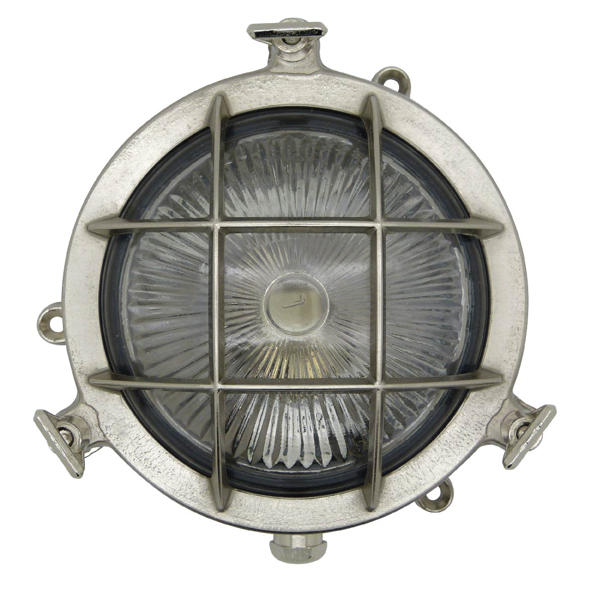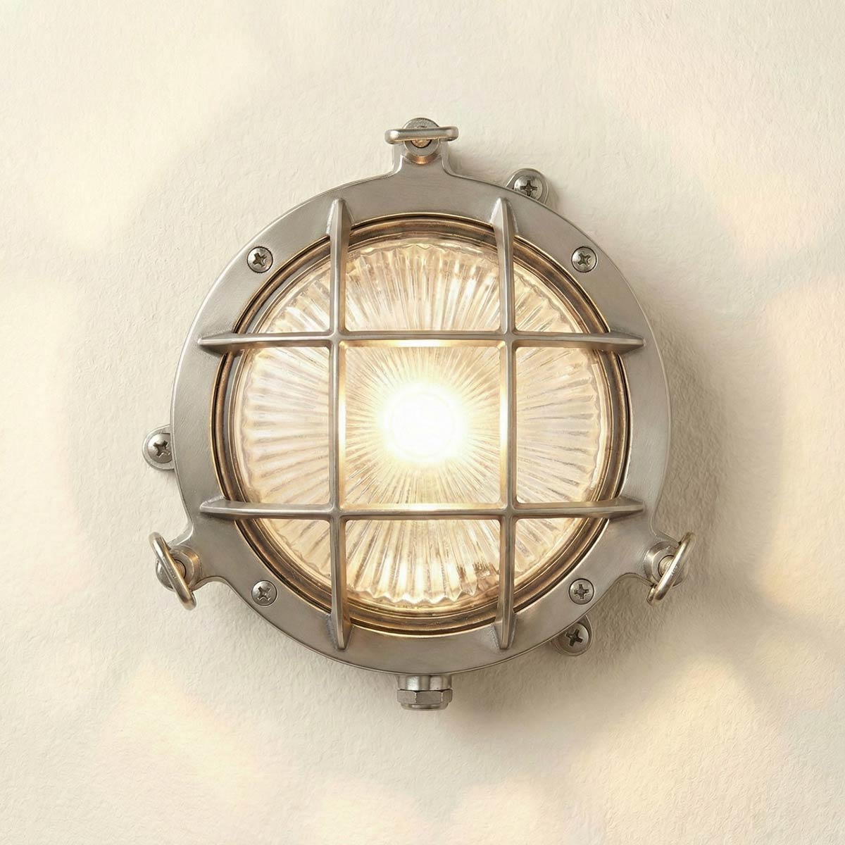 This Mini Compass Guard bulkhead light in satin nickel is rated IP44 and features classic nautical style. Safe to use outdoors in all weathers, it is made from satin nickel plated solid cast brass and ideal for use in severe weather coastal pathways. Featuring a circular 14cm diameter body, with three support legs, domed ribbed glass shade and protective outer guard.