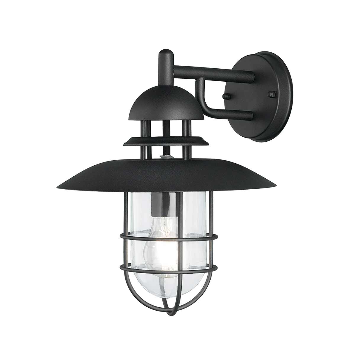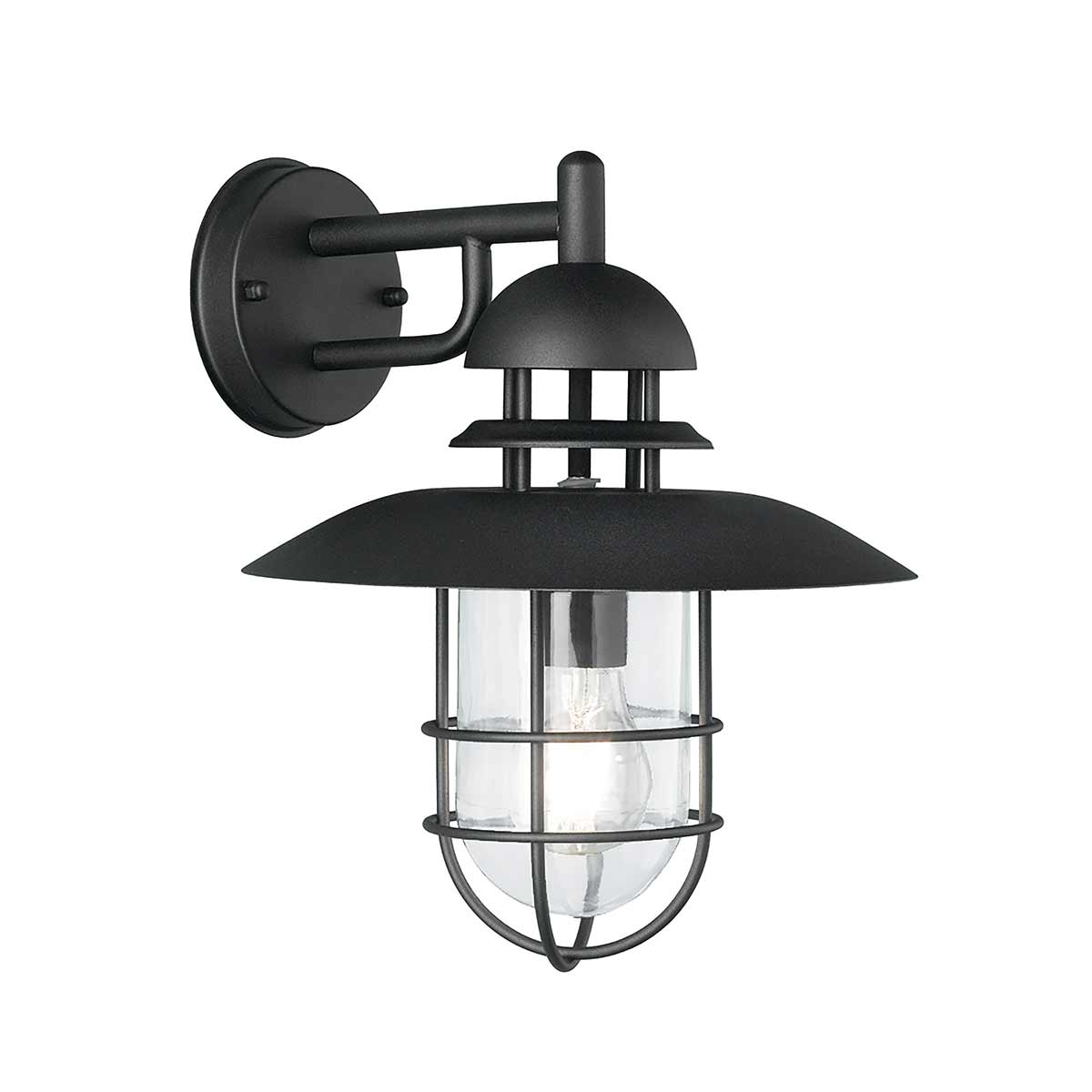 This modern 1 light exterior wall lantern in matt black with clear glass shade and rated IP44 features updated industrial style. Circular wall mount, straight braced arm and downward facing lantern. The lantern features a domed roof, wide brimmed rim and clear pill glass shade in a protective cage.