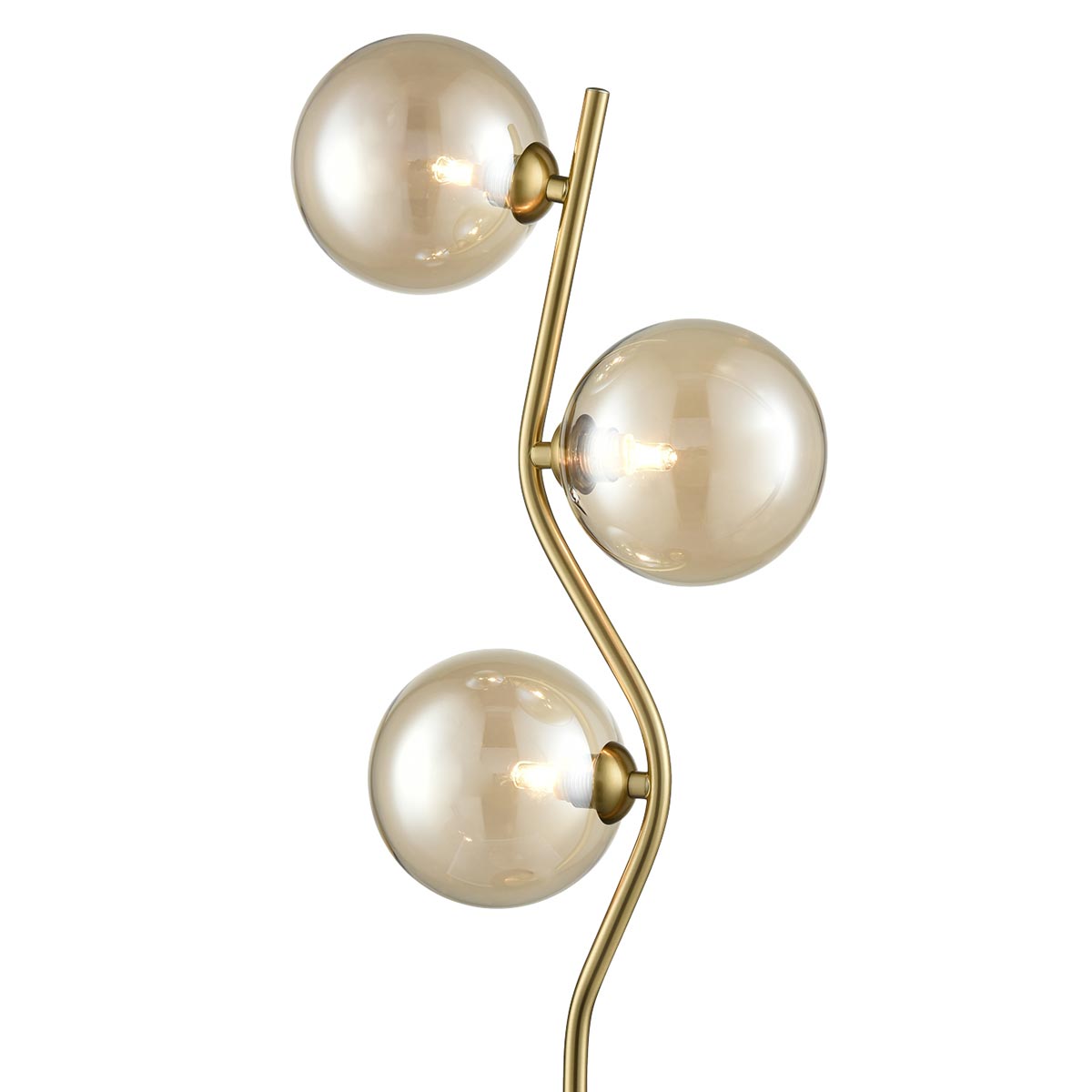 This modern 3 light table lamp in antique gold with amber glass shades from Franklite is attractive and practical. Part of the Cosmic collection, it features a black cylindrical base and wavy stem finished in antique gold. Three amber glass globes are nestled in the curves, creating a warm atmosphere. Fitted with a convenient in line switch and Ideal for a bedside, living or dining room table.