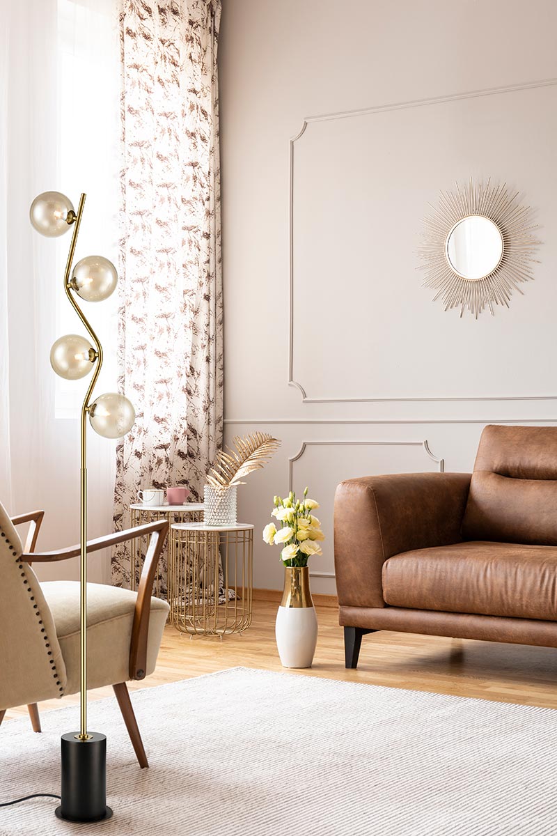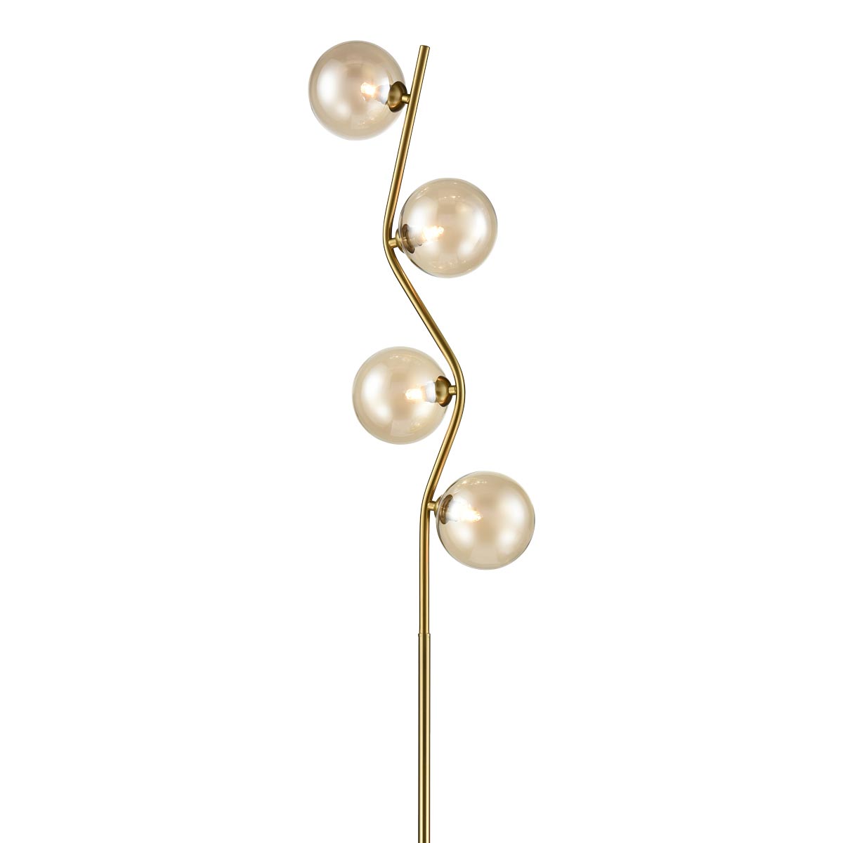 This modern 4 light floor lamp in antique gold with amber glass shades from Franklite is attractive and practical. Part of the Cosmic collection, it features a black cylindrical base and full height wavy stem finished in antique gold. Four amber glass globes are nestled in the curves, creating a warm atmosphere.