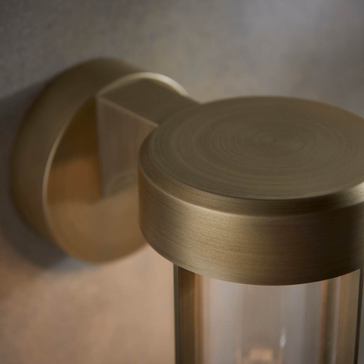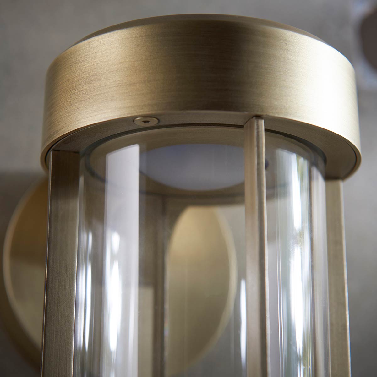 This nautical IP44 LED wall lantern in painted brushed gold with clear pill glass shade is contemporary and functional. Featuring a circular wall mount and top mounted arm, with downward facing clear pill glass shade and outer protective bars. Made from corrosion resistant die-cast aluminium and finished in brushed gold.