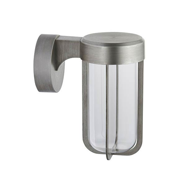 This nautical IP44 LED wall lantern in painted brushed silver with clear pill glass shade is contemporary and functional. Featuring a circular wall mount and top mounted arm, with downward facing clear pill glass shade and outer protective bars. Made from corrosion resistant die-cast aluminium and finished in brushed silver.