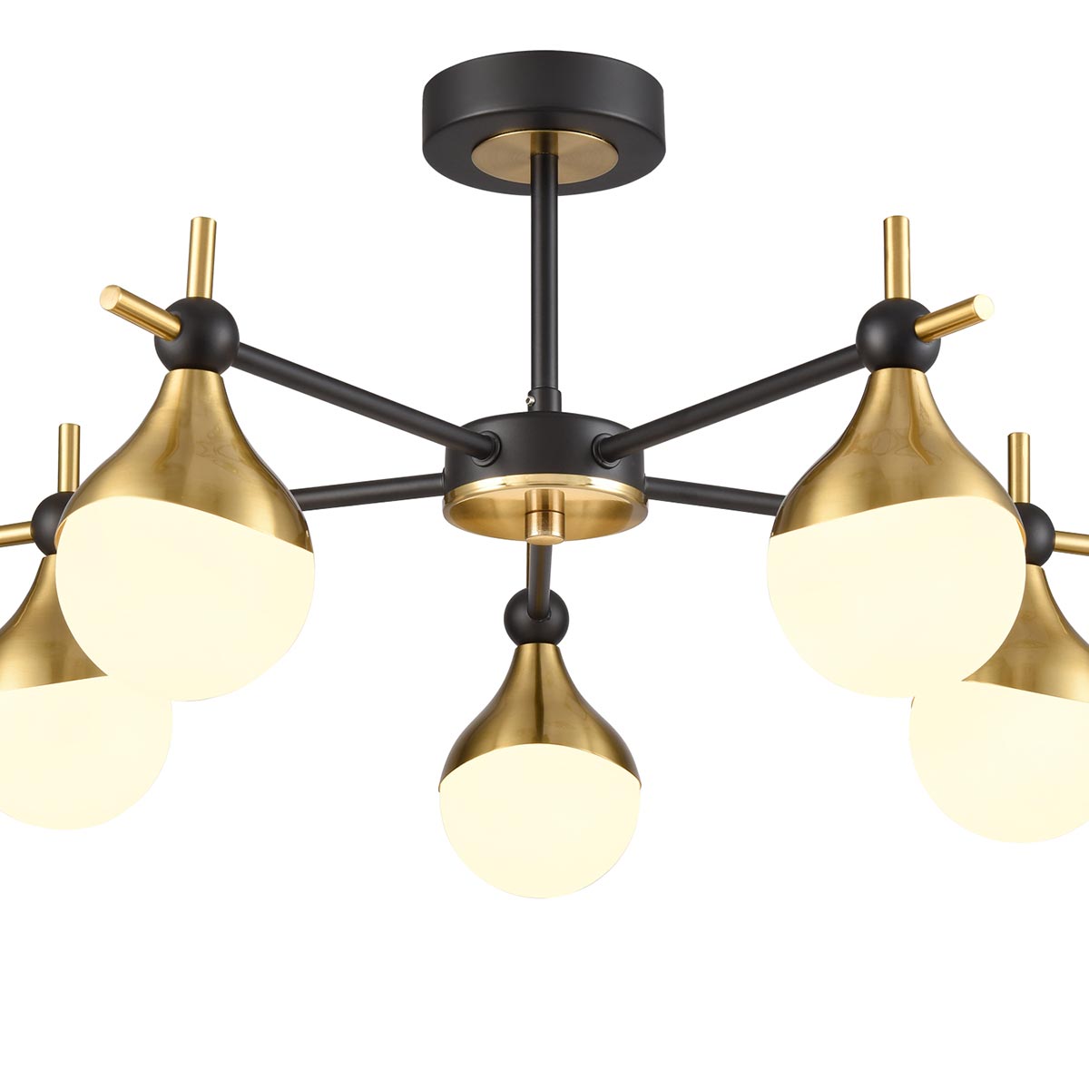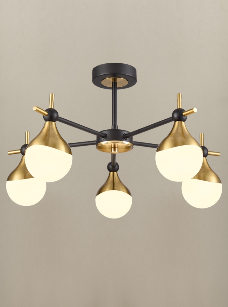 Introducing the Nexus 5 light semi flush ceiling light in matt black and aged brass with opal glass teardrop shades from Franklite. Designed for rooms with a low ceiling, the Nexus features a circular ceiling mount, short drop rod and five straight arms in matt black. Each arm features an aged brass finish teardrop shade, with opal white glass that diffuses the light beautifully.