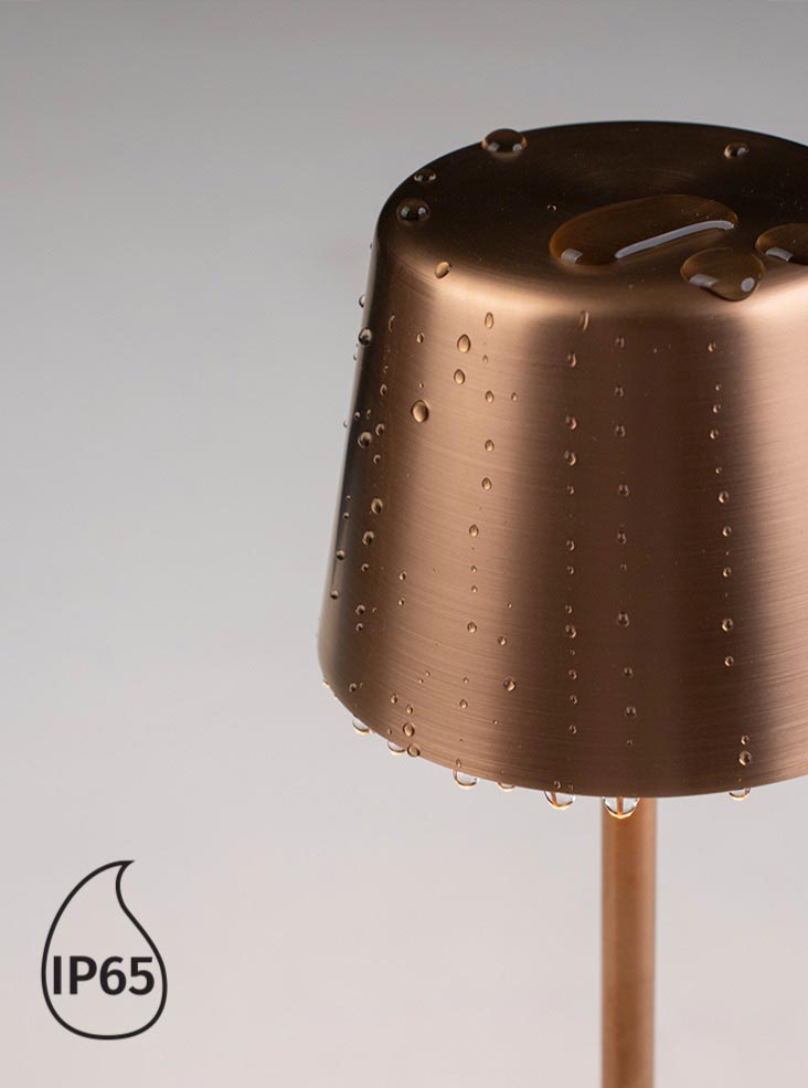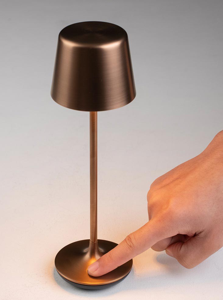 Ideal for any living room or garden patio table, the Nomad small rechargeable LED table lamp in a brushed bronze and rated IP65. Convenient and portable, this lamp is made from aluminium, with a round base, slender stem and deep sided brushed bronze finish shade. A switch is fitted to the base and controls the on / off, dimming function and colour temperature.
