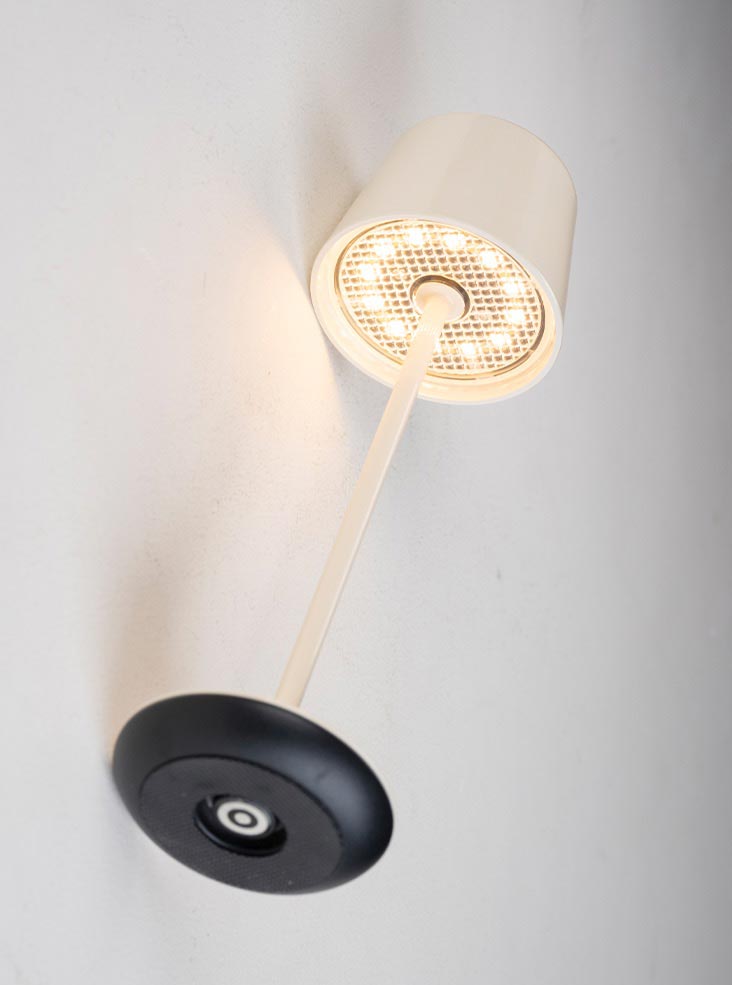 Ideal for any living room or garden patio table, the Nomad small rechargeable LED table lamp in a cream ceramic finish and rated IP65. Convenient and portable, this lamp is made from aluminium, with a round base, slender stem and deep sided shade. A switch is fitted to the base and controls the on / off, dimming function and colour temperature.