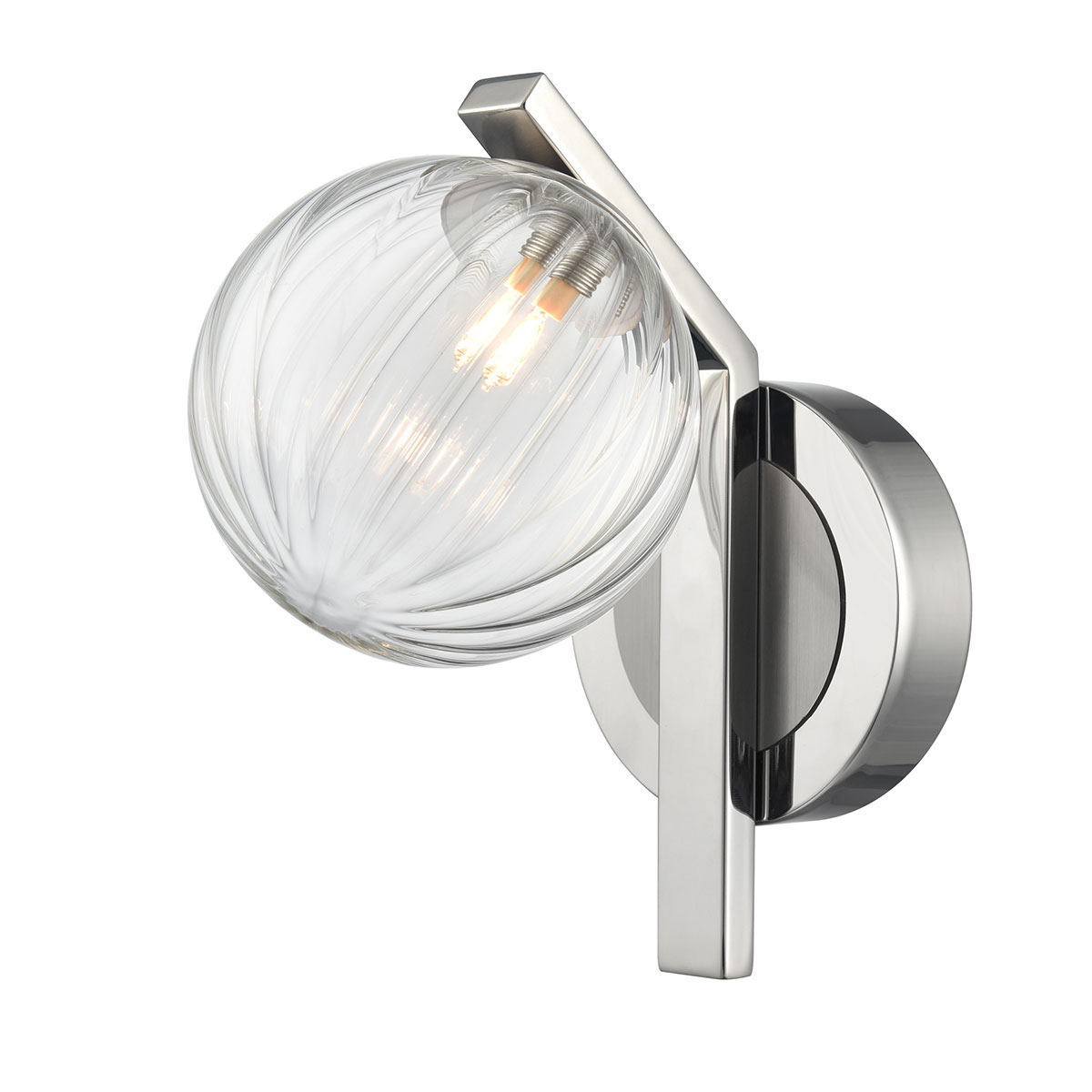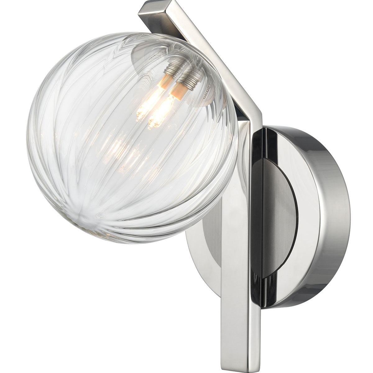 The Oculus single bathroom wall light in polished chrome and satin nickel with clear ribbed glass sphere from Franklite is rated IP44. Featuring a circular polished chrome wall mount with satin nickel detail and short upright bar that is angled at the tip. A stunning ribbed clear glass shade contains a capsule bulb, creating a twinkling light.
