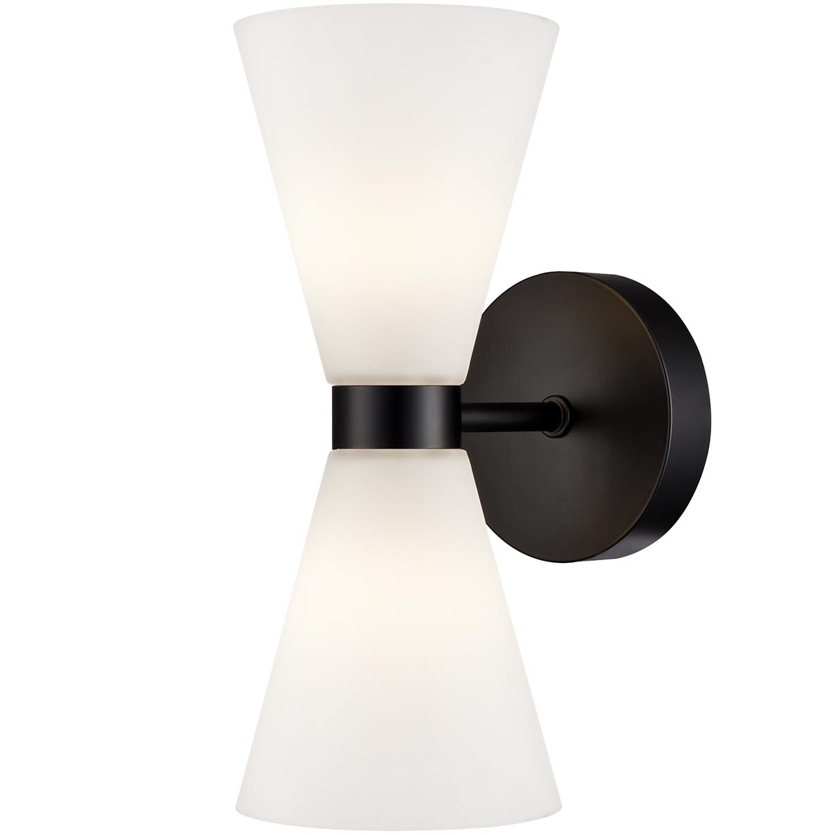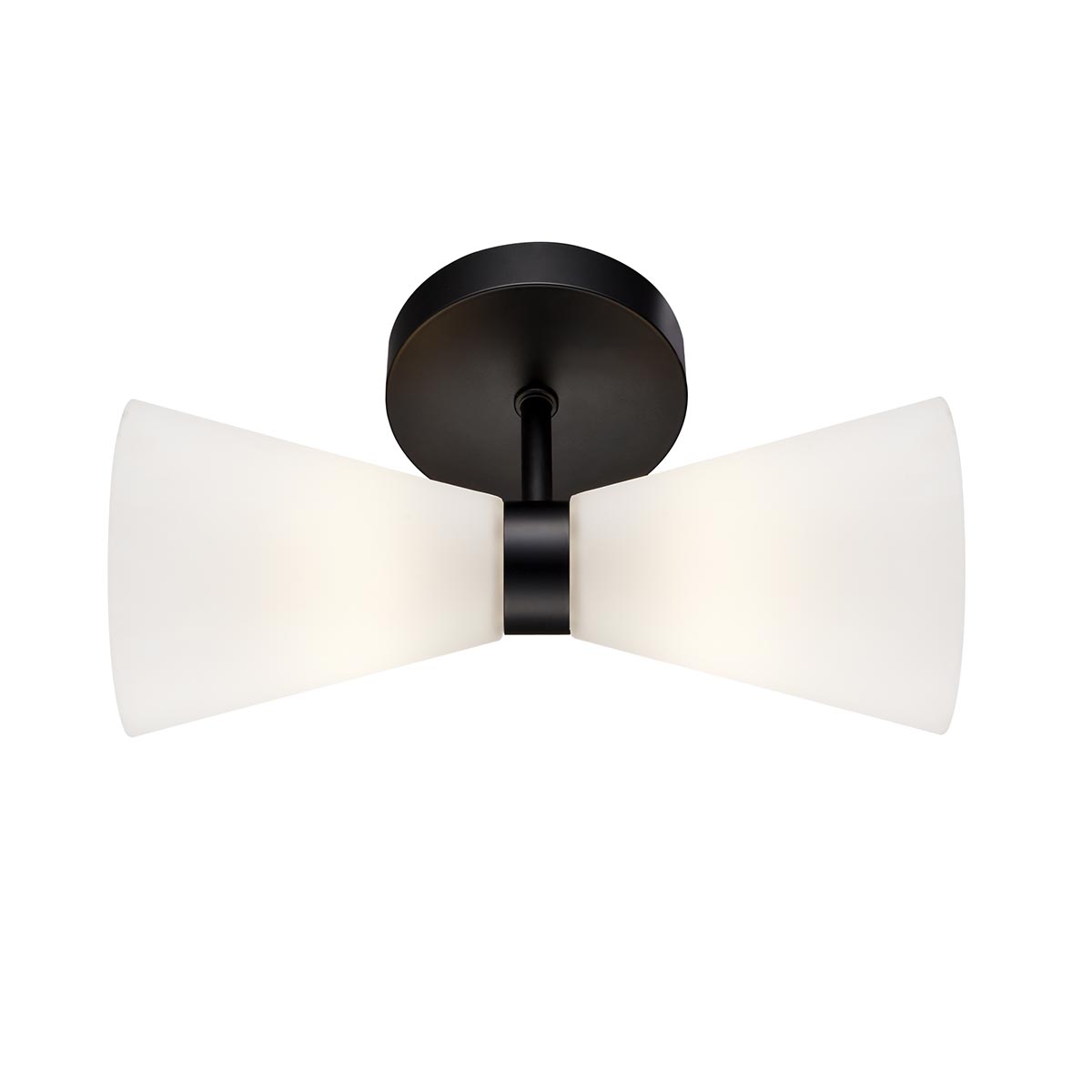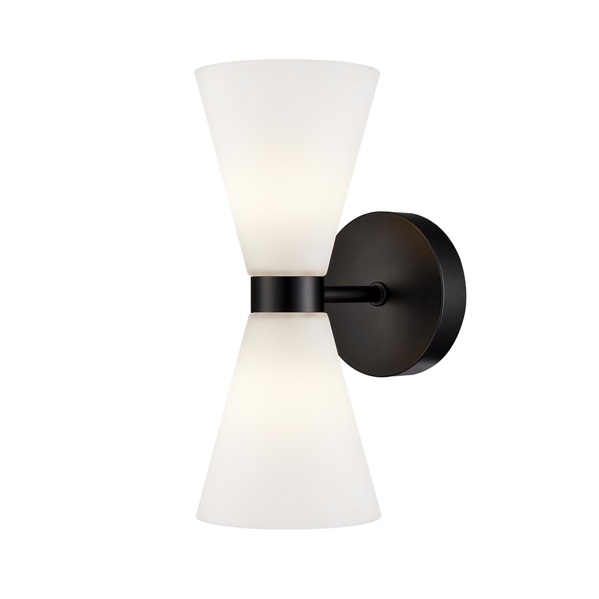 The Odeon matt black bathroom wall light with conical opal glass shades from Franklite is rated IP44. Featuring a circular wall mount in matt black, a short arm and two opal white glass cone shades. The two shades contain a capsule bulb and create a warm diffused light.