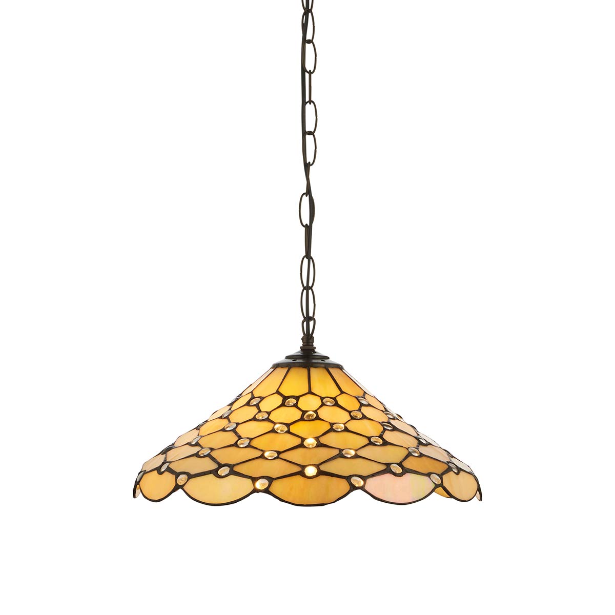 Attached by a circular ceiling rose and chain, this wonderful ceiling light is height adjustable, and it’s dimmable too. A traditional Tiffany ceiling light, suitable for any room that still looks fresh and up-to-date in more modern surroundings. Perfect for a bedroom, hallway, living room or over a dining room table.