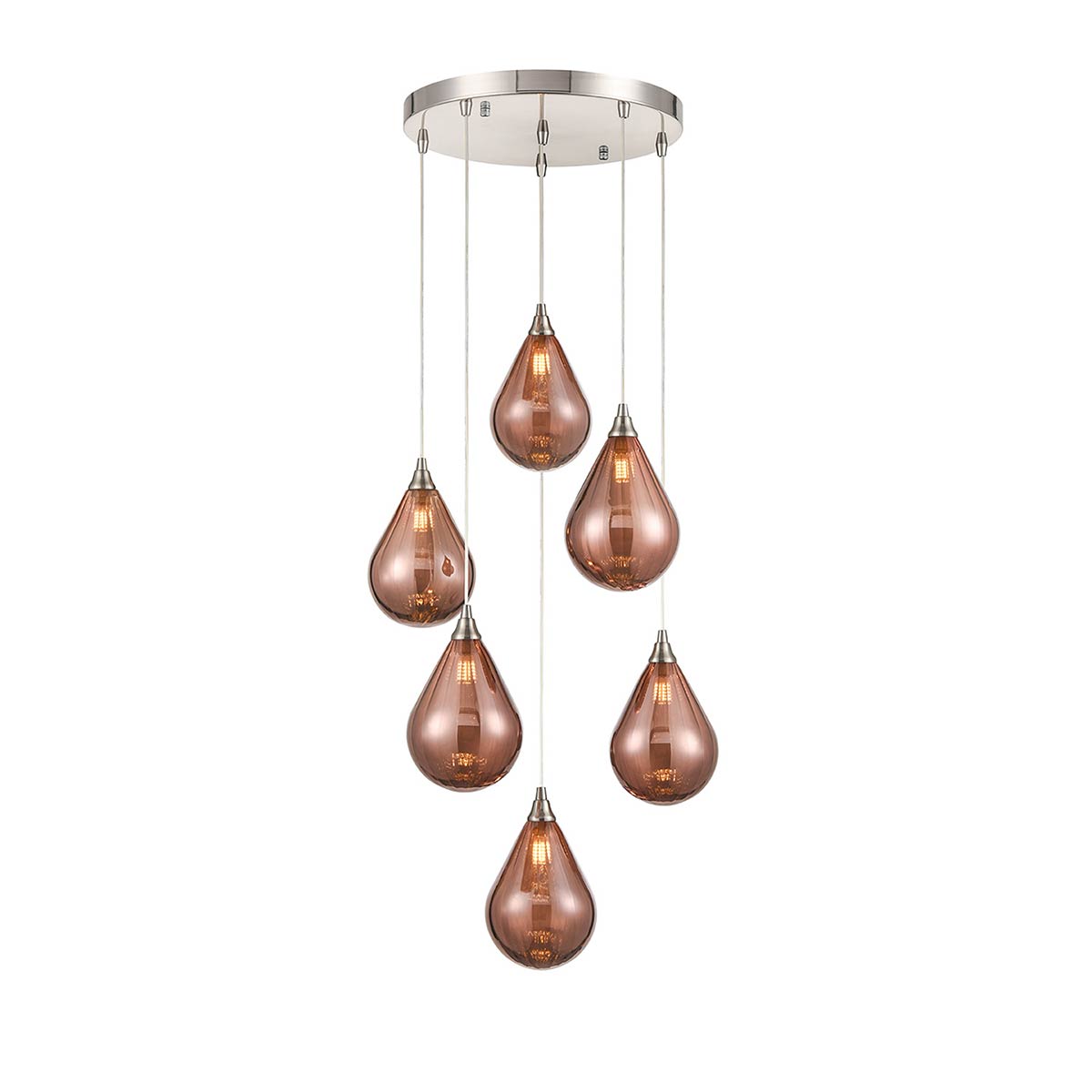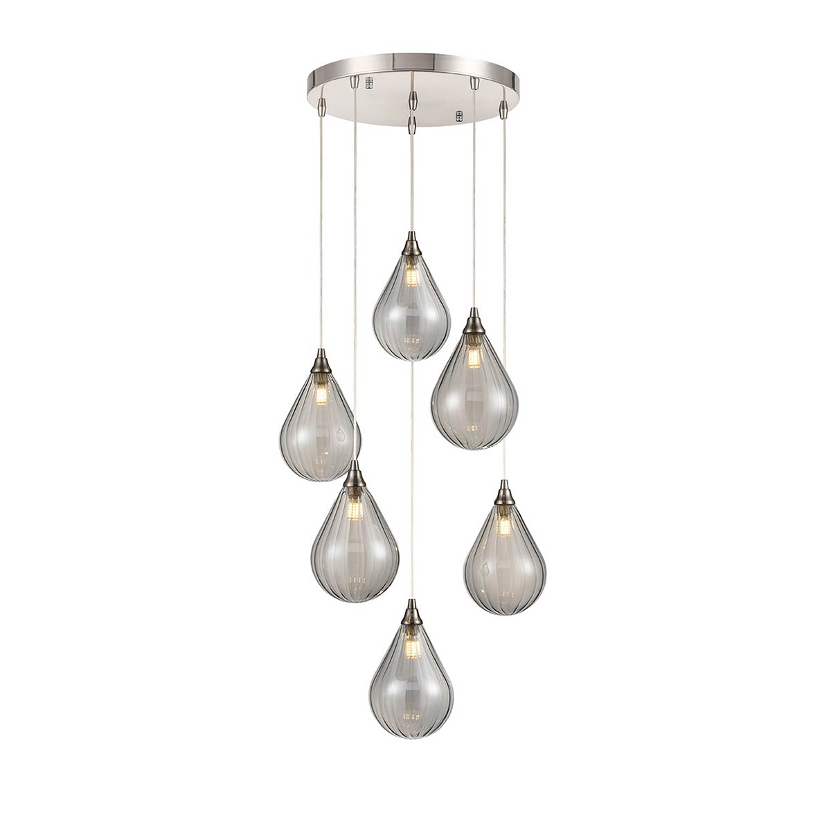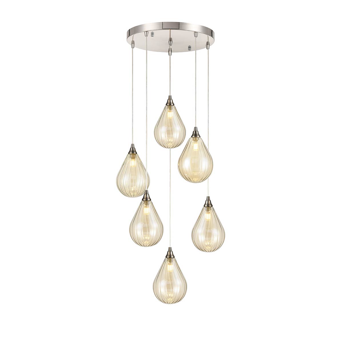 The Perry 6 light pendant with teardrop glass shades in satin nickel from Franklite. Featuring a circular ceiling plate, with six teardrop glass shades attached by black cable suspension. The six cables are height adjustable when fitting, so you can get the look that suits you best. Ideal for a hallway, stairwell, kitchen or hung low over a dining room table.