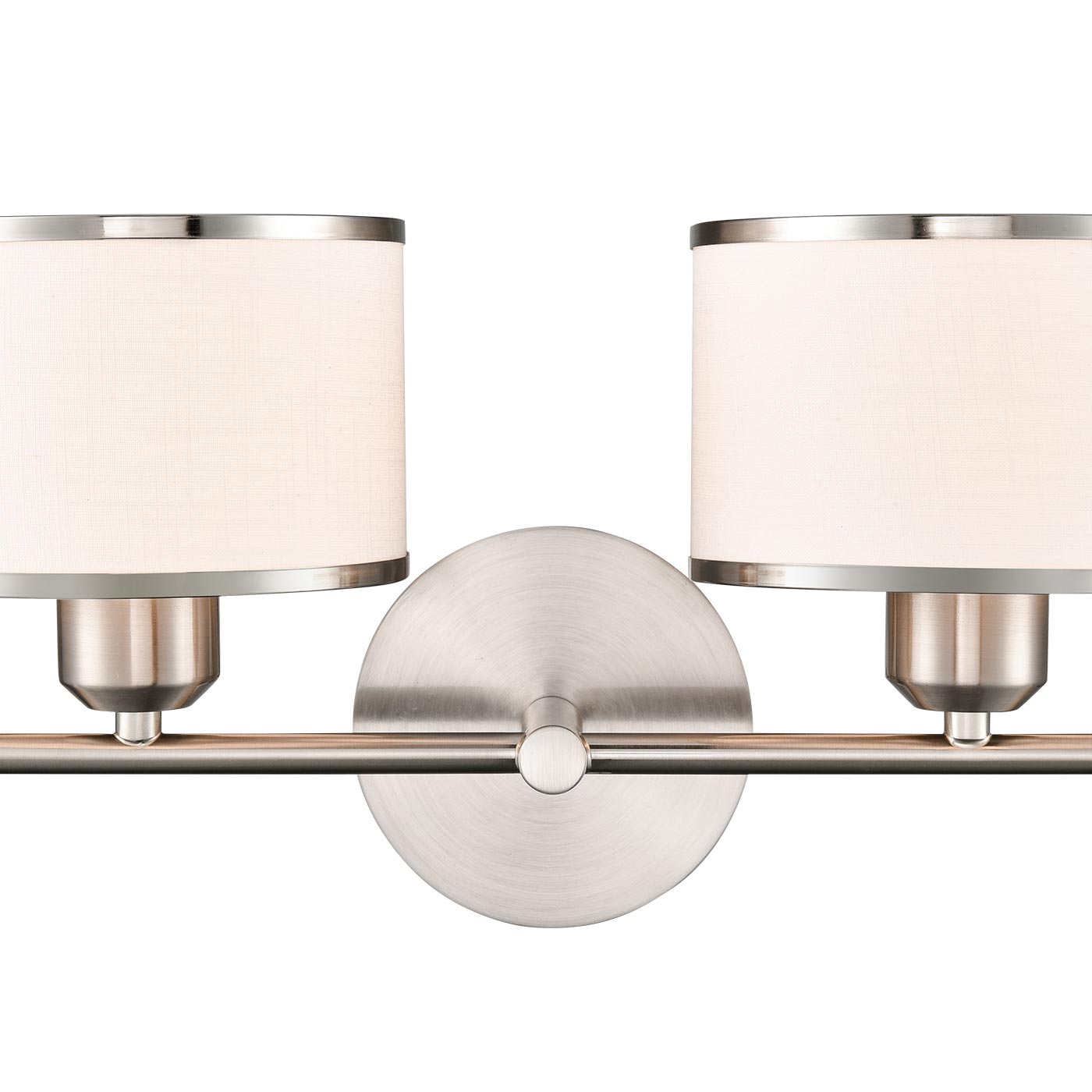 At home in both modern and traditional settings, this 2 lamp wall light boasts sleek good looks and the two bulbs provide ample light. The satin nickel finish is timeless, and the off-white fabric shades complement any decor, making it ideal for us on a bedroom, hallway, living or dining room wall.