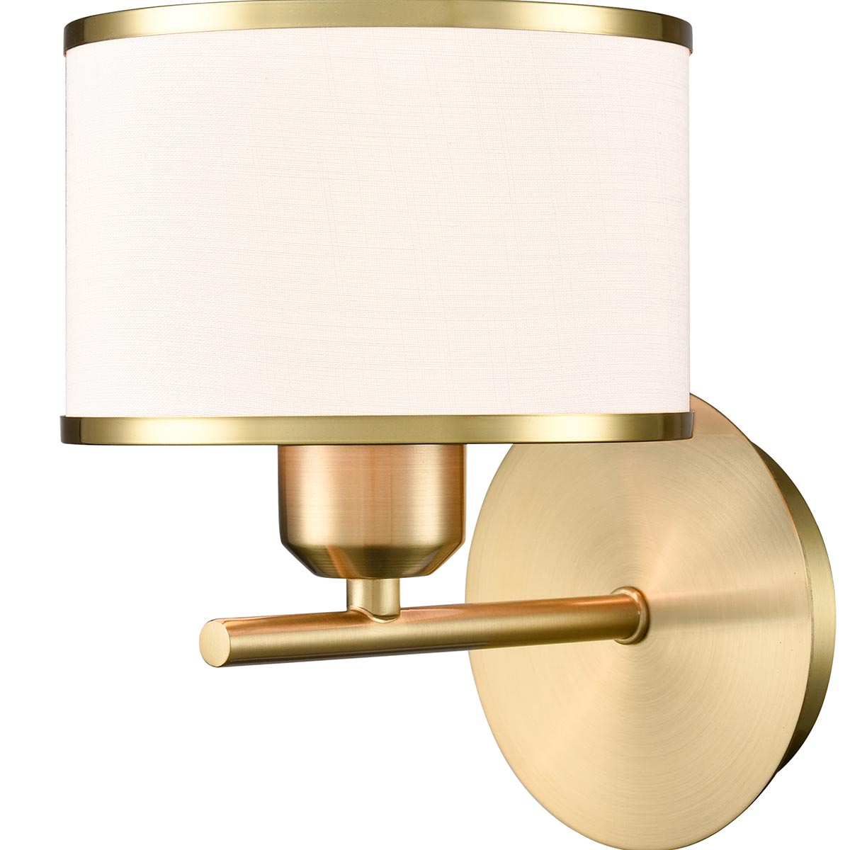 At home in both modern and traditional settings, this 1 lamp wall light boasts sleek good looks and the single bulb provides ample light. The aged brass finish is warm, and the off-white fabric shade complements any decor, making it ideal for us on a bedroom, living or dining room wall.