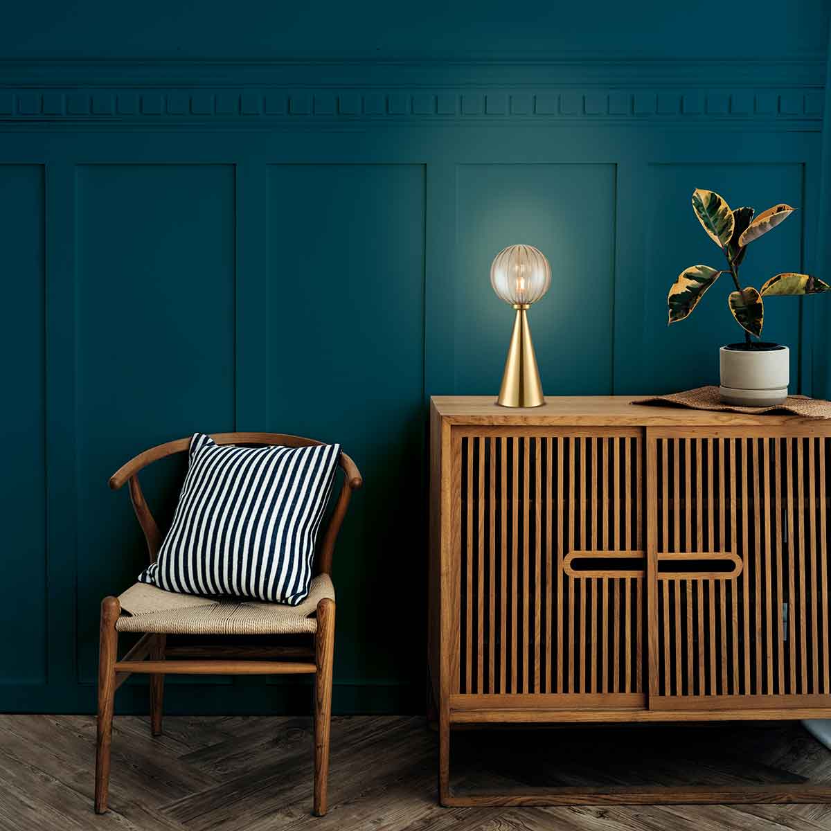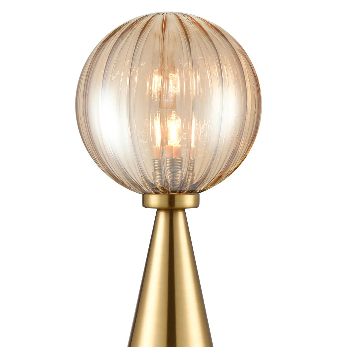 New for 2026, the Quasar touch table lamp in aged brass with ribbed amber glass globe shade from Franklite features sophisticated vintage charm. Boasting a tapered conical base with a ribbed amber glass globe shade sitting on top. Fitted with a convenient touch operated on / off function, simply touch the base to turn on and again to switch off.