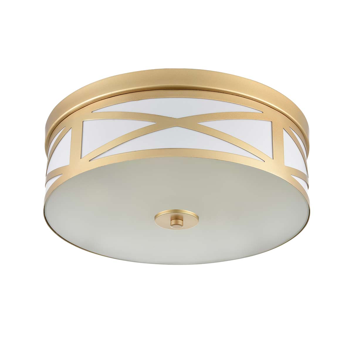 The large Franklite Ringo 3 light flush ceiling light in gold with opal glass base is modern and attractive. Designed for rooms with a low ceiling, this flush light features a 38cm diameter painted gold frame, with opal acrylic panel and crisscross decorations on the sides. Three bulbs sit inside and shine through a lower opal etched glass shade for a soft glare free light.