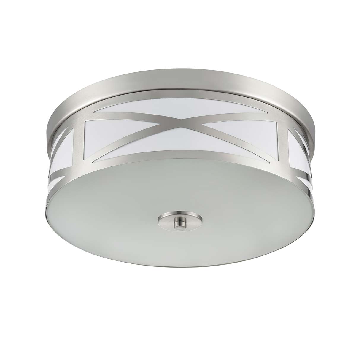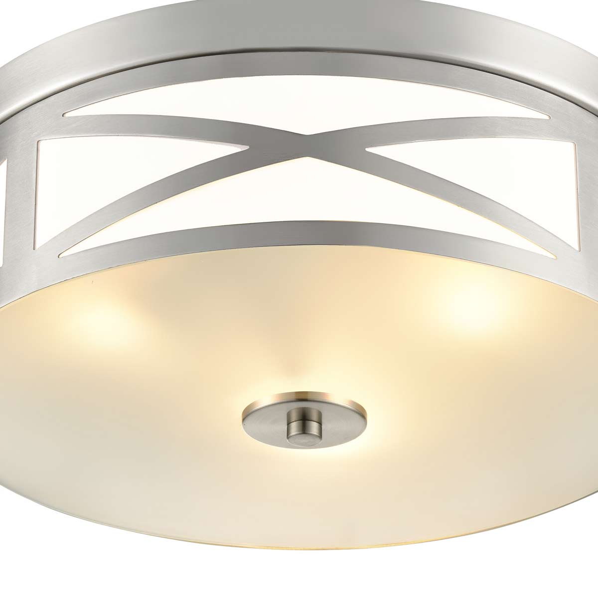 The large Franklite Ringo 3 light satin nickel flush ceiling light with opal glass base is modern and attractive. Designed for rooms with a low ceiling, this flush light features a 38cm diameter satin nickel frame, with opal acrylic panel and crisscross decorations on the sides. Three bulbs sit inside and shine through a lower opal etched glass shade for a soft glare free light.