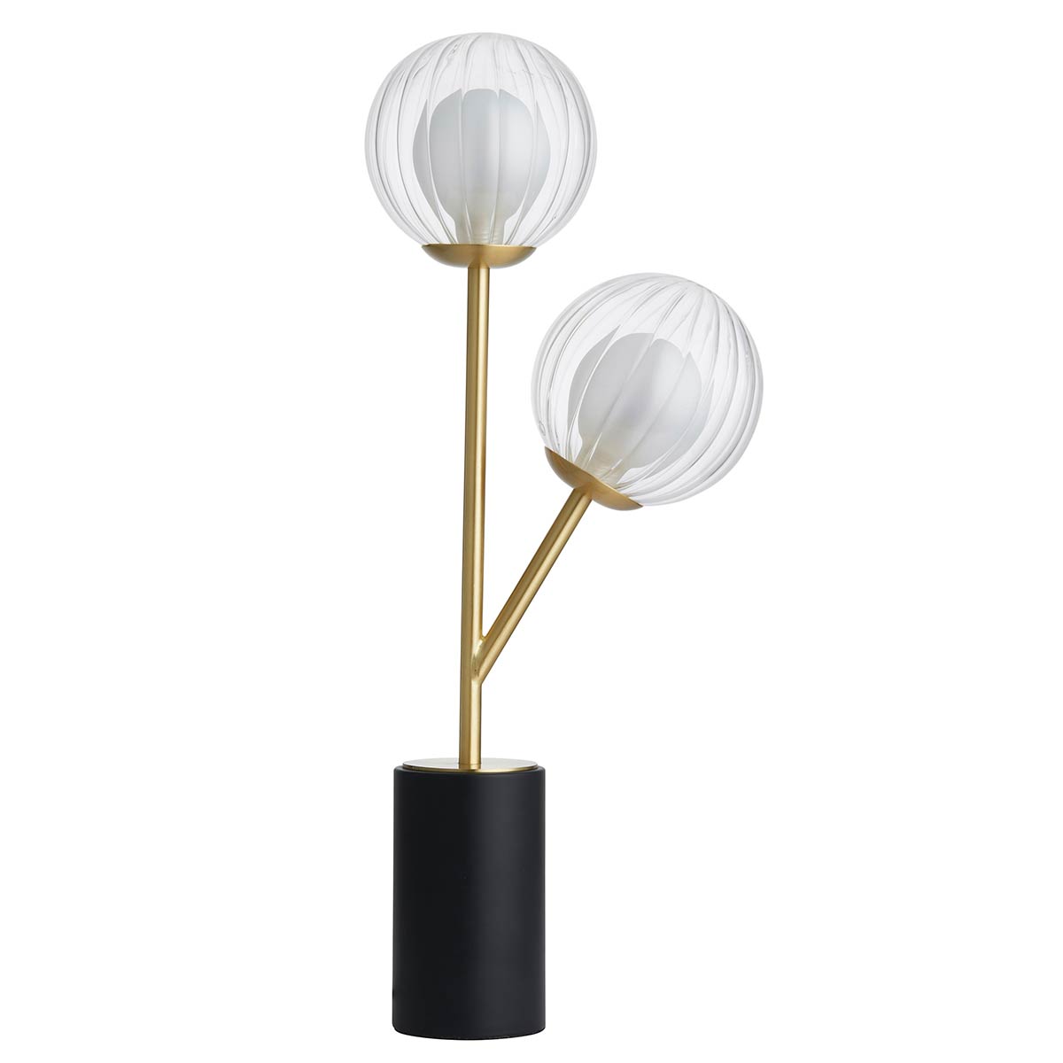Transform any room with this 2 light table lamp in satin brass with ribbed and frosted glass shades and modern industrial style. Featuring a matt black cylinder base, with straight stem and branching arm fitted with clear ribbed glass globes with frosted glass inner shades. Supplied with 1.5m of black fabric cable and inline rocker switch.