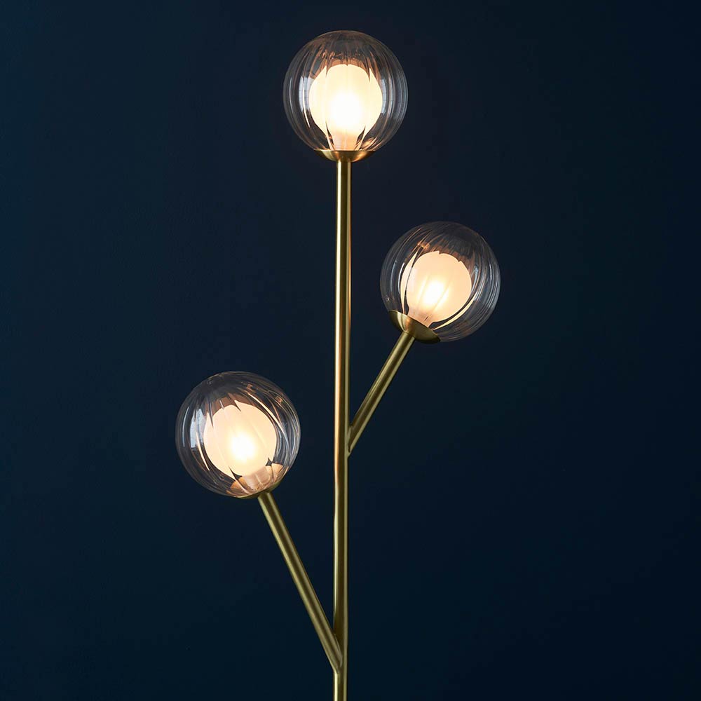 Transform any room with this 3 light floor lamp in satin brass with ribbed and frosted glass shades and modern industrial style. Featuring a matt black cylinder base, with tall straight stem and two branching arms fitted with clear ribbed glass globes and frosted glass inner shades. Supplied with 2m of black fabric cable and foot operated inline switch.
