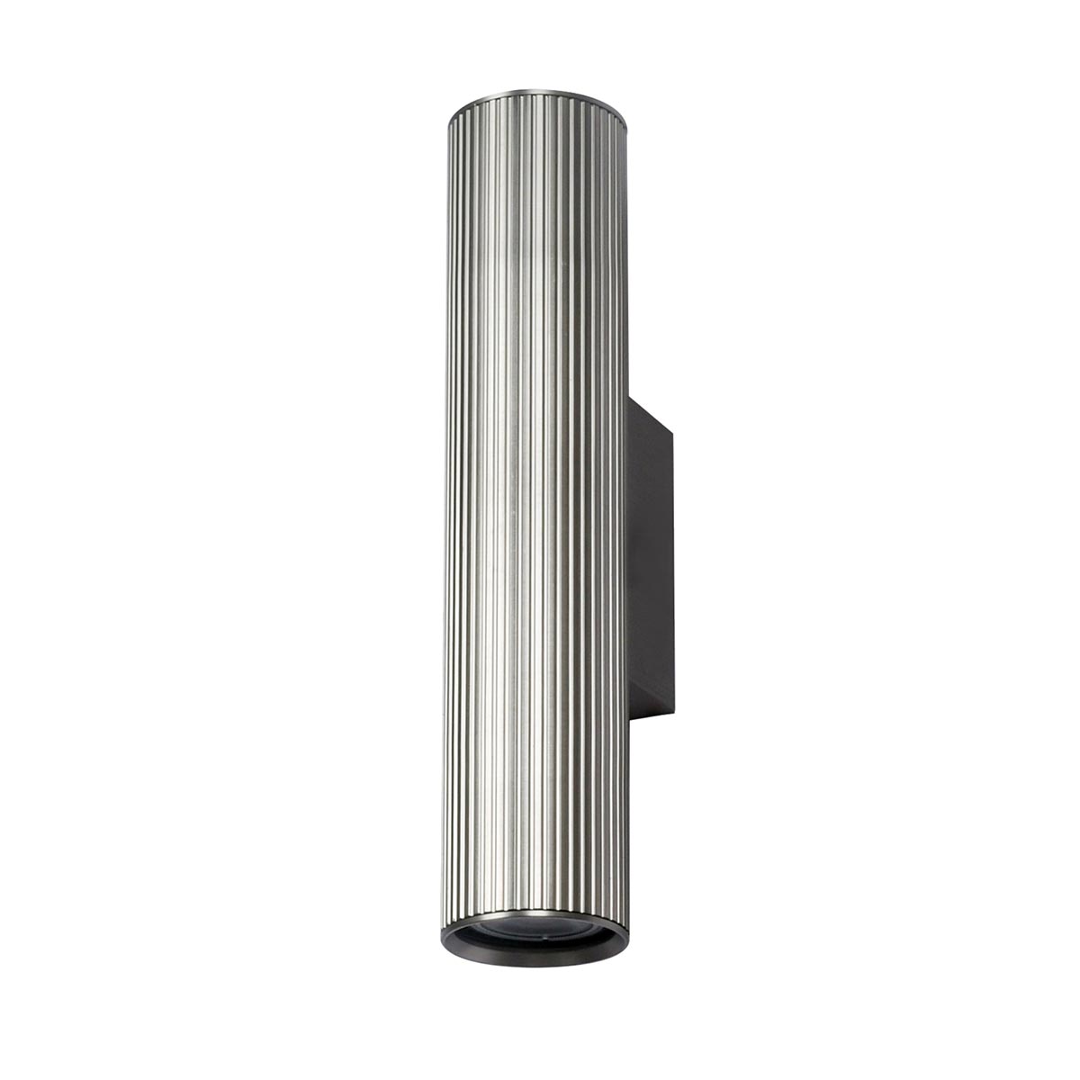 New for 2026, the Scout modern up and down wall light in satin nickel finish from Franklite is sleek and practical. A modern design, featuring a slim rectangular wall mount and upright ribbed cylinder body housing two spotlight bulbs. One bulb shines upwards and the other down, to wash the wall above and below with a bright beam of light.