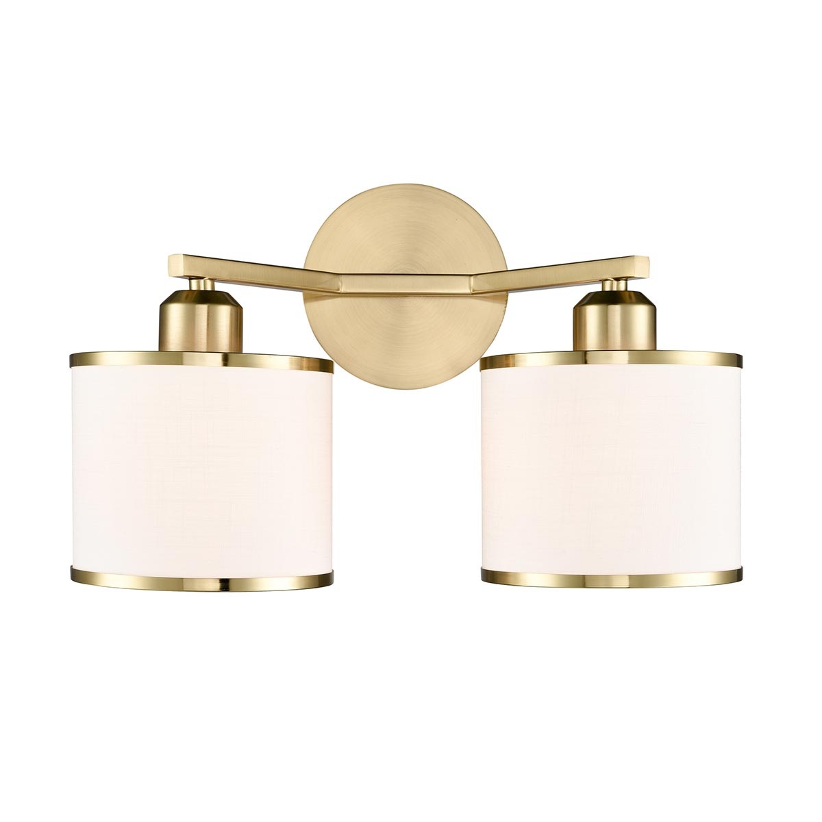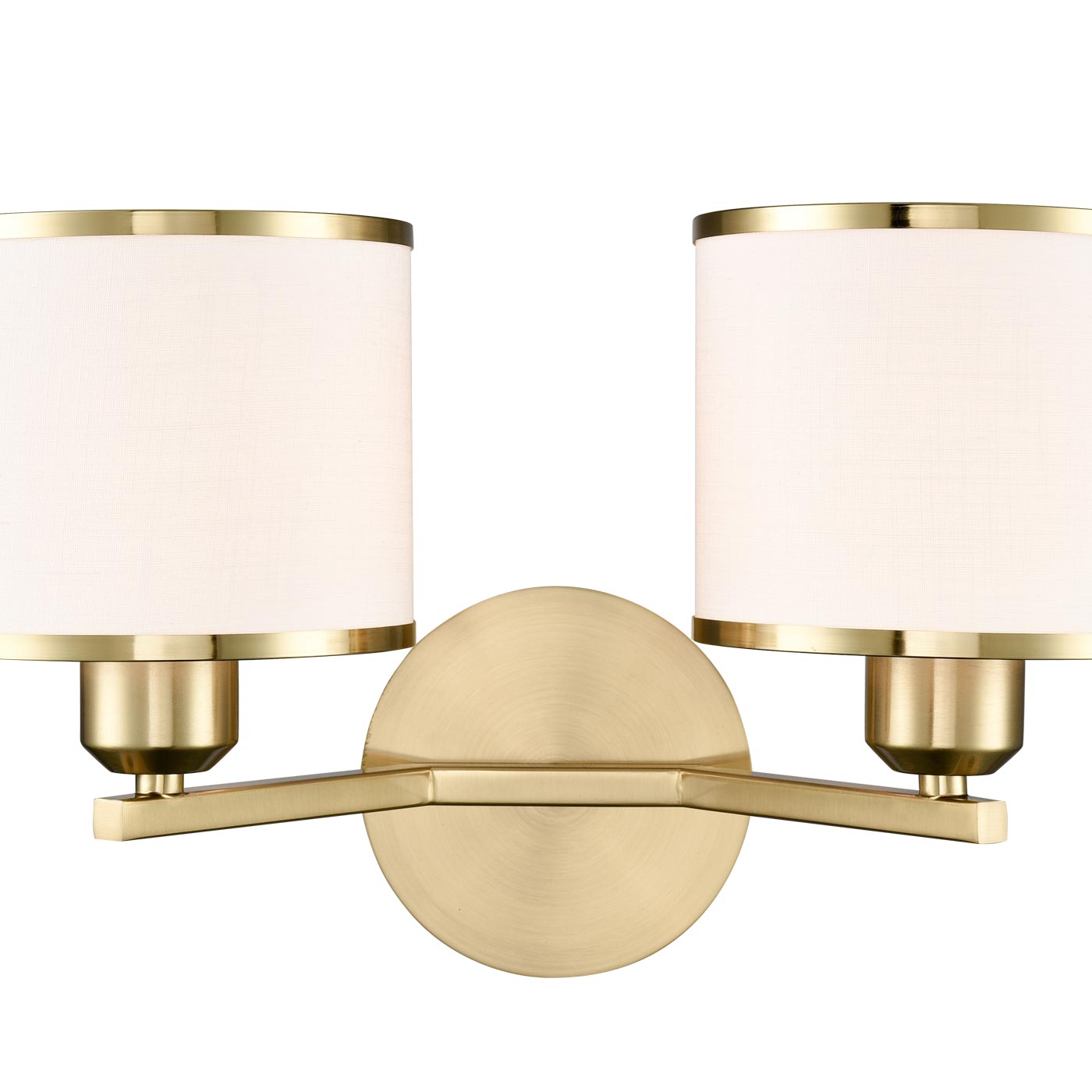 The Sirius twin aged brass wall light with off-white textured fabric shades and matching trims. This twin wall light can help create a boutique hotel look, with its circular wall mount, chunky angled mounting bar and two textured fabric shades that soften the light beautifully. Part of the Polaris collection by Franklite, trusted for quality lighting.