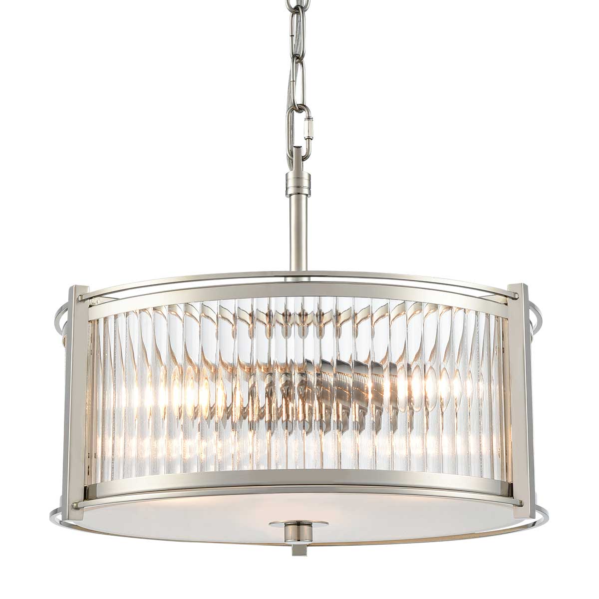 The Sloane 3 light pendant, the highest quality inspired design that combines polished nickel metalwork with ribbed and frosted glass to create a stylish, sophisticated ceiling light. Suitable for both traditional and modern homes, this dual mount ceiling pendant is the ideal size for lighting a bedroom, living or dining room.