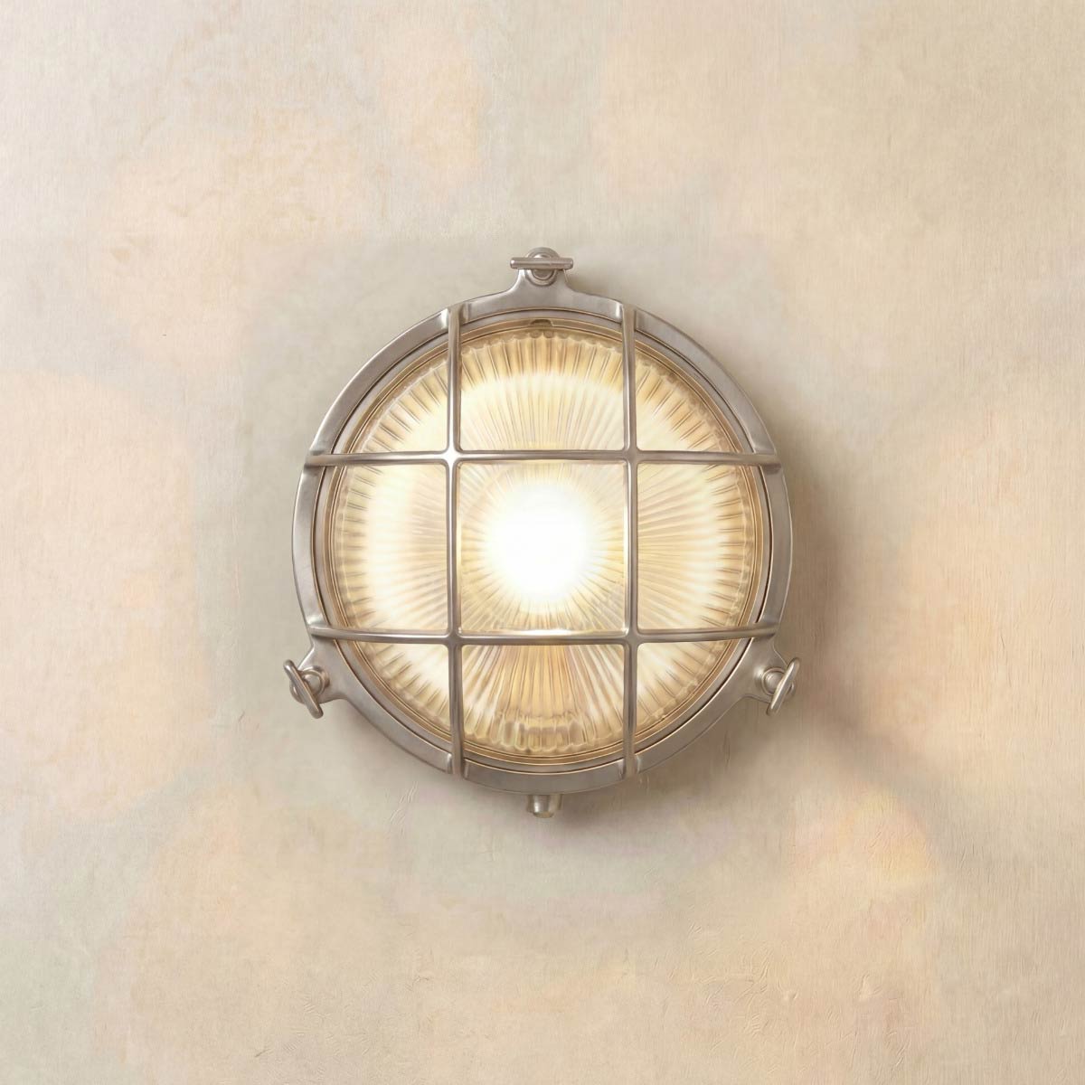 This small porthole bulkhead light in nickel plated solid brass is rated IP64 and features classic nautical style. Safe to use outdoors in all weathers, it is made from unpolished solid cast brass and ideal for use in severe weather coastal locations. Featuring a circular 21cm diameter body, with clear ribbed glass diffuser and protective bars.