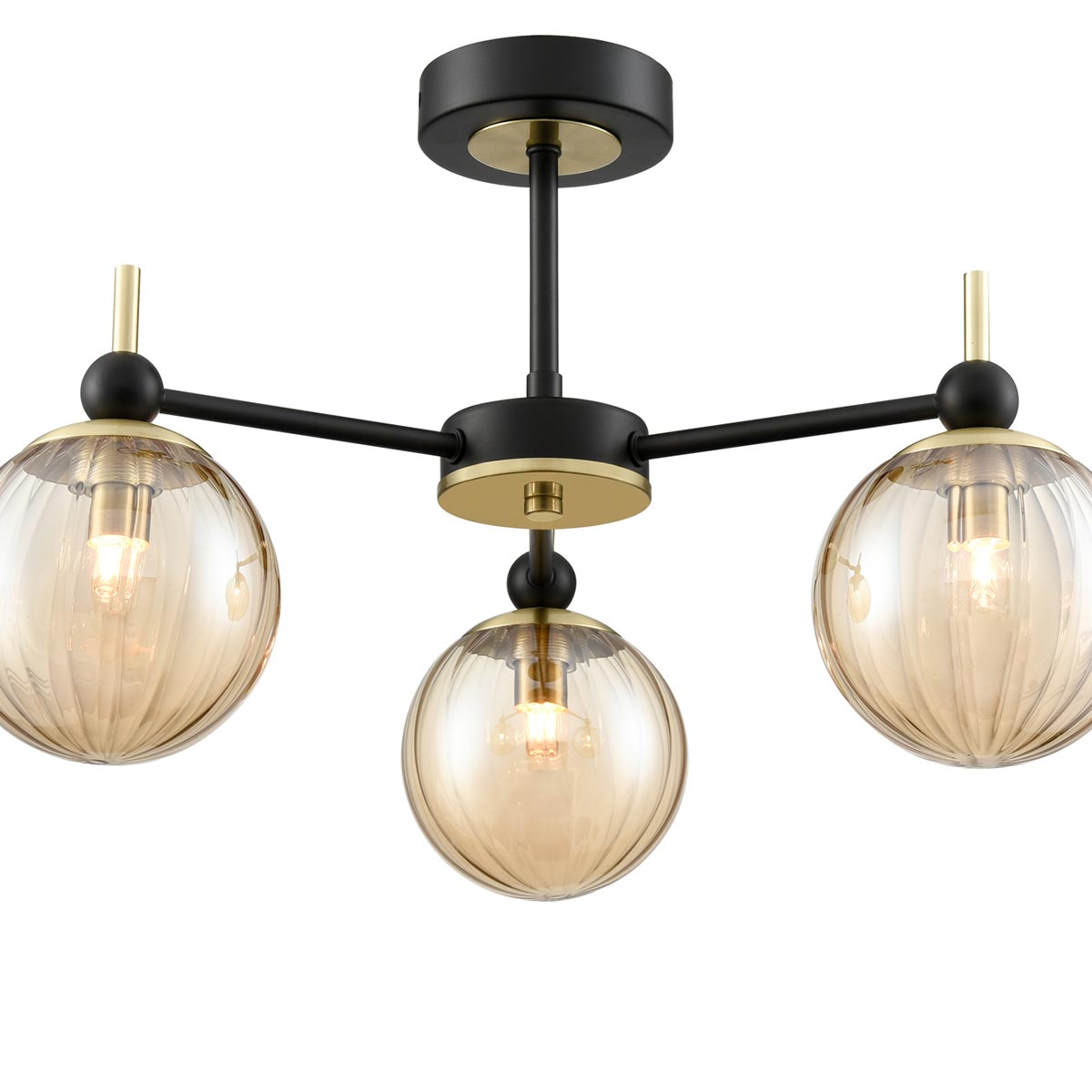 New for 2026, the Solar 3 light semi flush ceiling light in matt black and satin brass with amber glass globe shades from Franklite. Designed for rooms with a low ceiling, the Solar features a circular ceiling mount, short drop rod and three straight arms in matt black with satin brass details. Each arm features a downward facing ribbed amber glass globe shade.