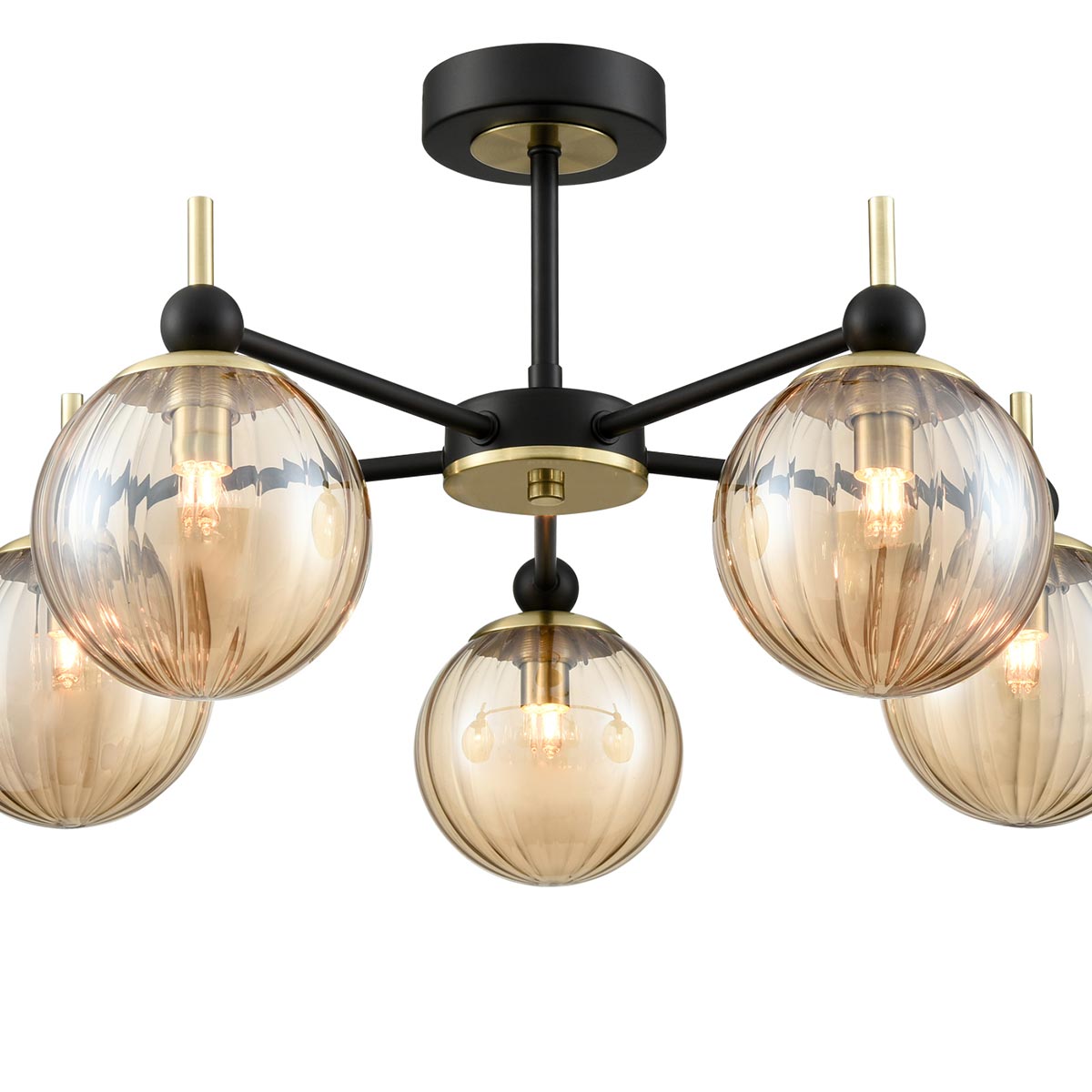 New for 2026, the Solar 5 light semi flush ceiling light in matt black and satin brass with amber glass globe shades from Franklite. Designed for rooms with a low ceiling, the Solar features a circular ceiling mount, short drop rod and five straight arms in matt black with satin brass details. Each arm features a downward facing ribbed amber glass globe shade.