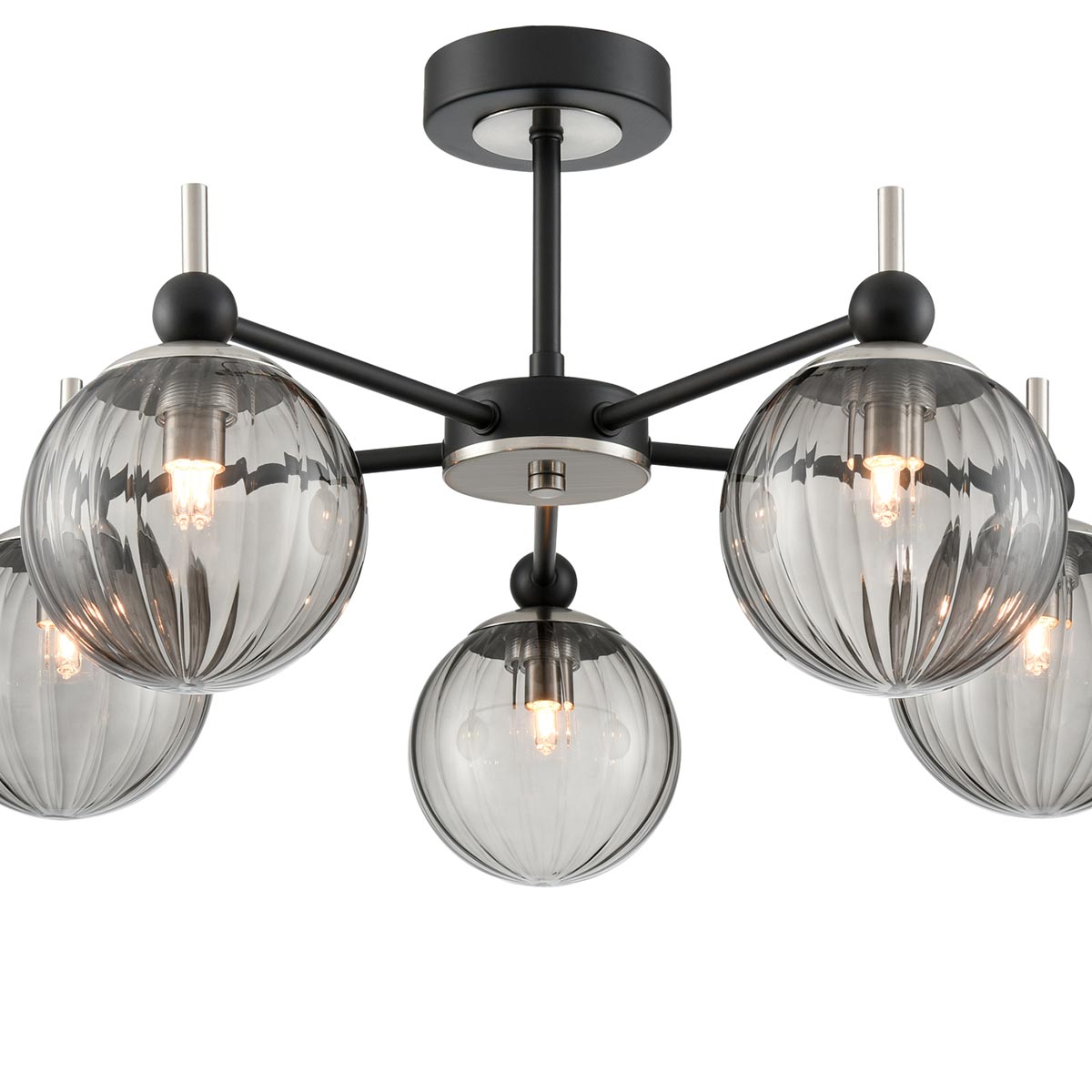 New for 2026, the Solar 5 light semi flush ceiling light in matt black and satin nickel with smoked glass globe shades from Franklite. Designed for rooms with a low ceiling, the Solar features a circular ceiling mount, short drop rod and five straight arms in matt black with satin nickel details. Each arm features a downward facing ribbed smoked glass globe shade.
